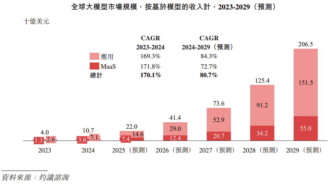 根據灼識諮詢,目前全球大模型市場仍處於商業化落地的早期階段。以基於模型的收入口徑計,全球大模型市場將由2024年的107億美金快速增長至2029年的2065億美金,CAGR達到80.7%。在大模型應用市場規模預計將由2024年的71億美元增至2029年的1515億美元,CAGR達到84.3%;與此同時,大模型MaaS市場規模有望由2024年的36億美元增至2029年的550億美元,CAGR達到72.7%。