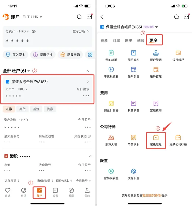 「APP > 帳戶 > 任意帳戶卡片 > 更多 > 選股選息」