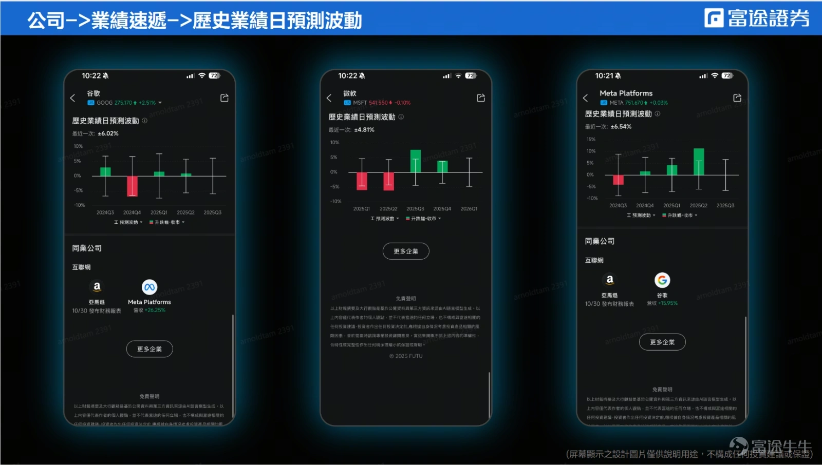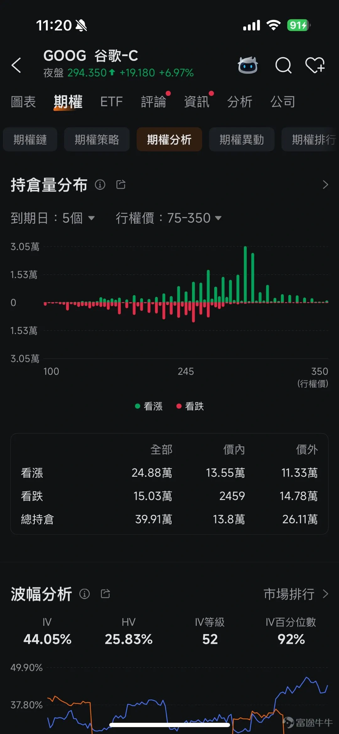 此外,牛友可以留意一下手机分析业绩功能,使用期权进行分析对公司的预测波动。以昨日GOOG、 $微软(MSFT.US)$ 、和 $Meta Platforms(META.US)$ 作为例子,分别预期业绩后股价的波动是±6.02%、±4.81%和±6.54%。公司业绩后的波动会否超出预期之外,才是反映市场真正的看法。