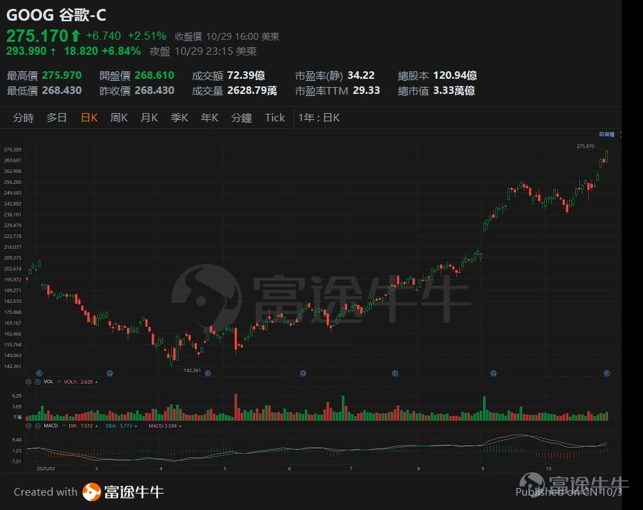 $谷歌-C(GOOG.US)$ 股价于业绩公布后再创新高,但考虑到公司现时最新的市盈率TTM仍处于30倍以下,公司最新季度的每股收益是2.87美元,按年上升35.4%。用PEG的角度去衡量,不排除会陆续有分析师上调评级和目标价。公司现时整个增长亮点围绕AI业务且回复正轨,加上核心业务的优势和地位稳健,估值有望和微软拉近。有货的投资者不妨继续中长线持有。从最新的业绩表现看,公司有望继续跑赢 $标普500指数(.SPX.US)$ 和 $纳斯达克综合指数(.IXIC.US)$ 。