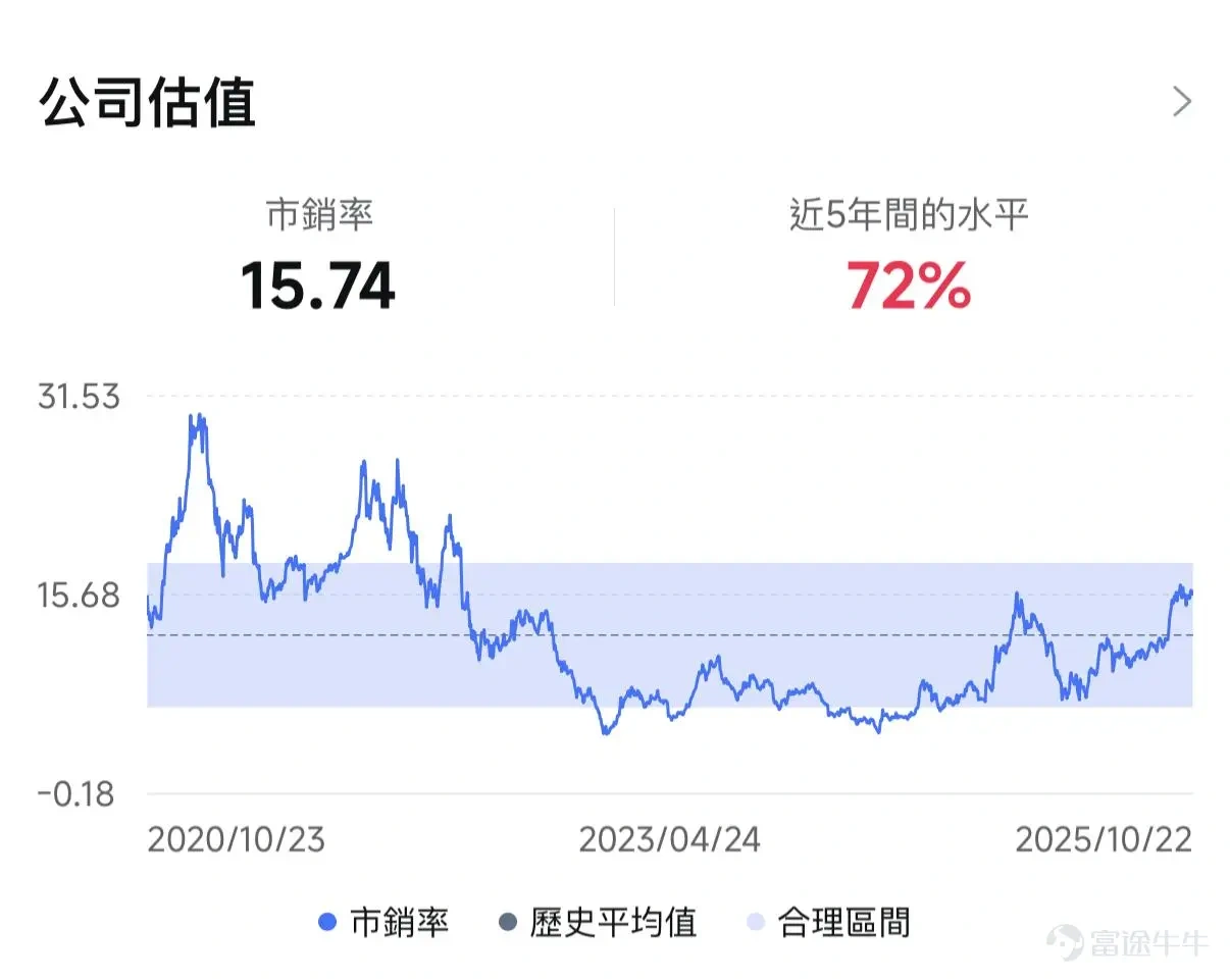 Tesla正处于「转型阵痛期」,传统卖车业务毛利受压,但AI、FSD与机械人等新业务正蓄势待发。现时市销率(PS)约16倍,在过去5年不算高水平,估值尚算合理(见下图)。