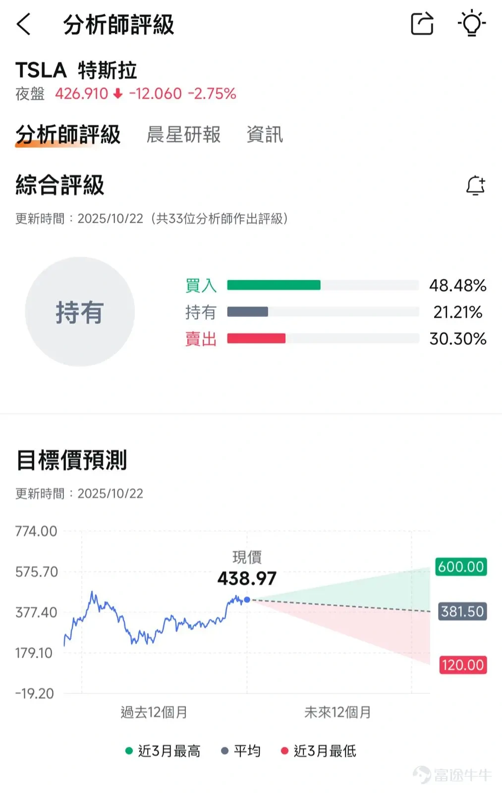 参考牛牛app的分析师评级,逾一半表示建议「买入」及「持有」Tesla,平均目标价睇382美元,最牛更是看600美元(见下图)。