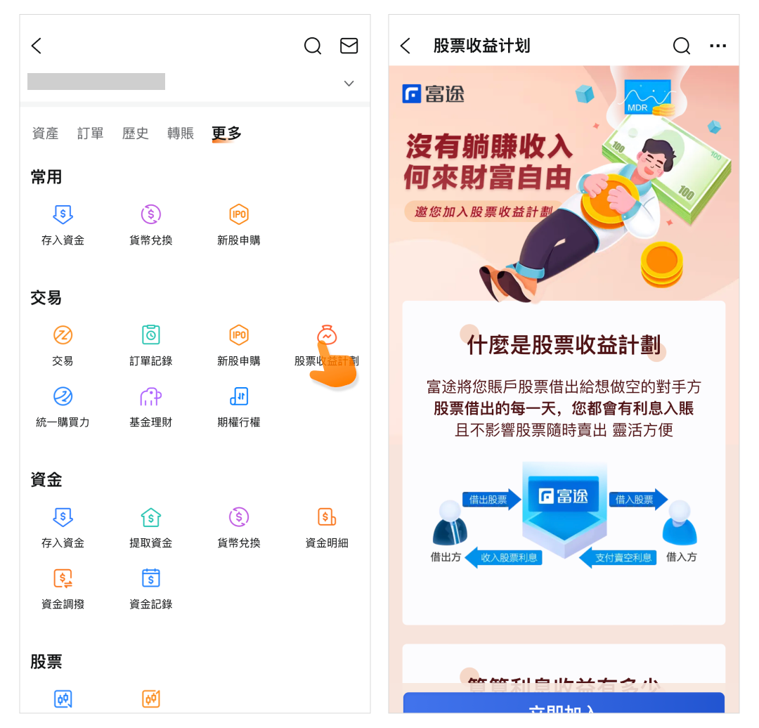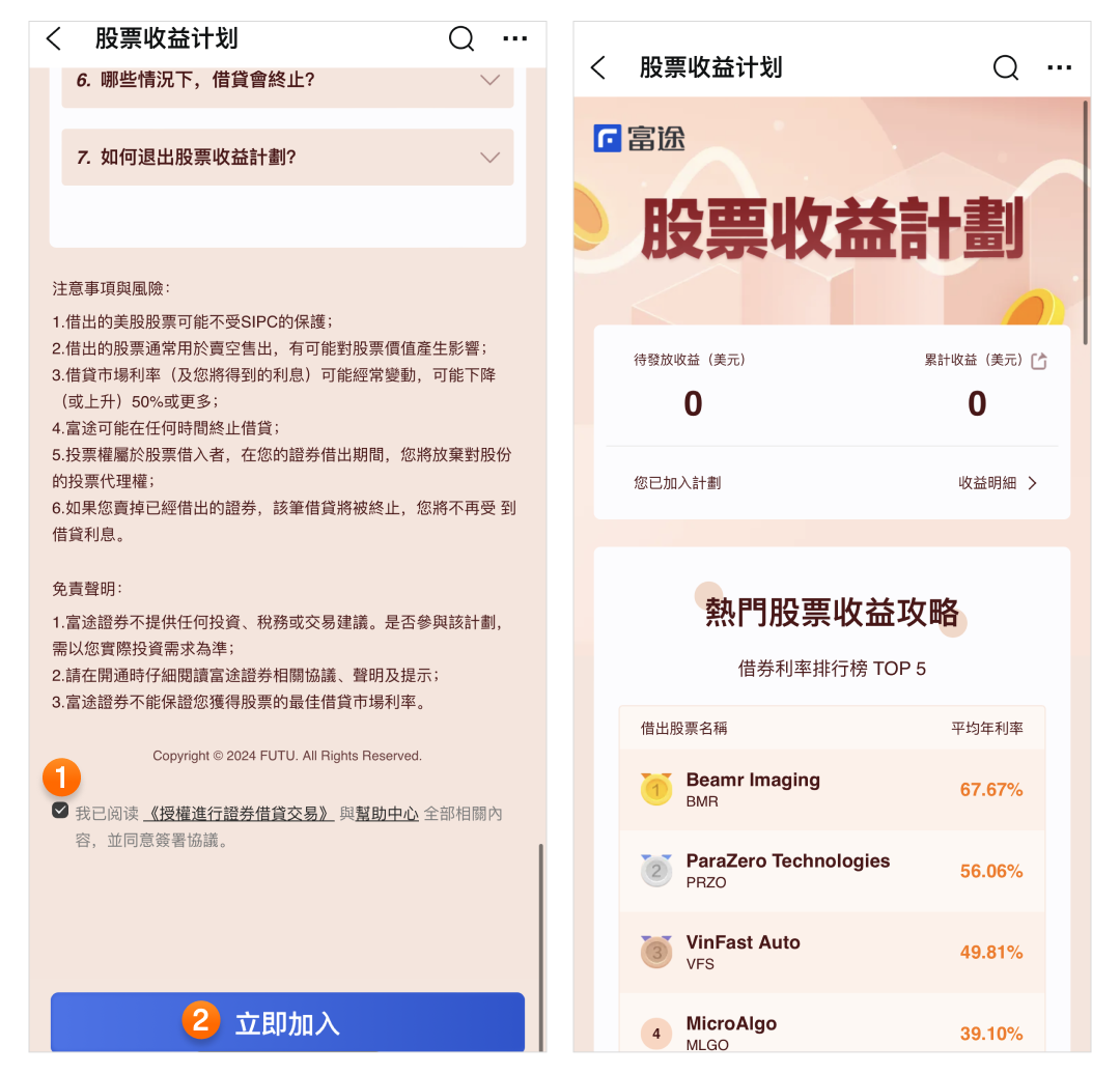 若要加入「股票收益计划」,请在阅读并勾选底部的协议后再点击「立即加入」。