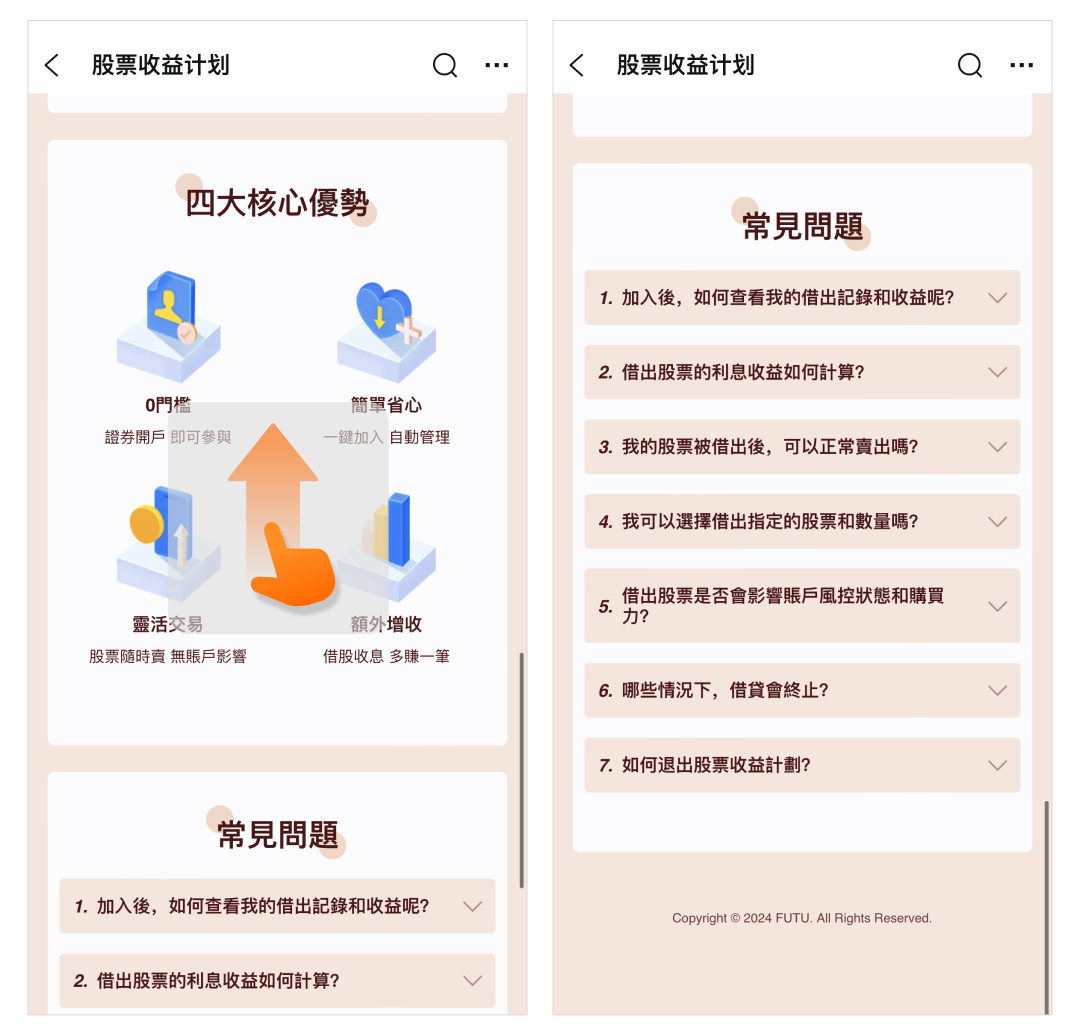 “股票收益计划”页面下方还为您提供了热门股票收益攻略、利息收益、核心优势、常见问题等相关内容。