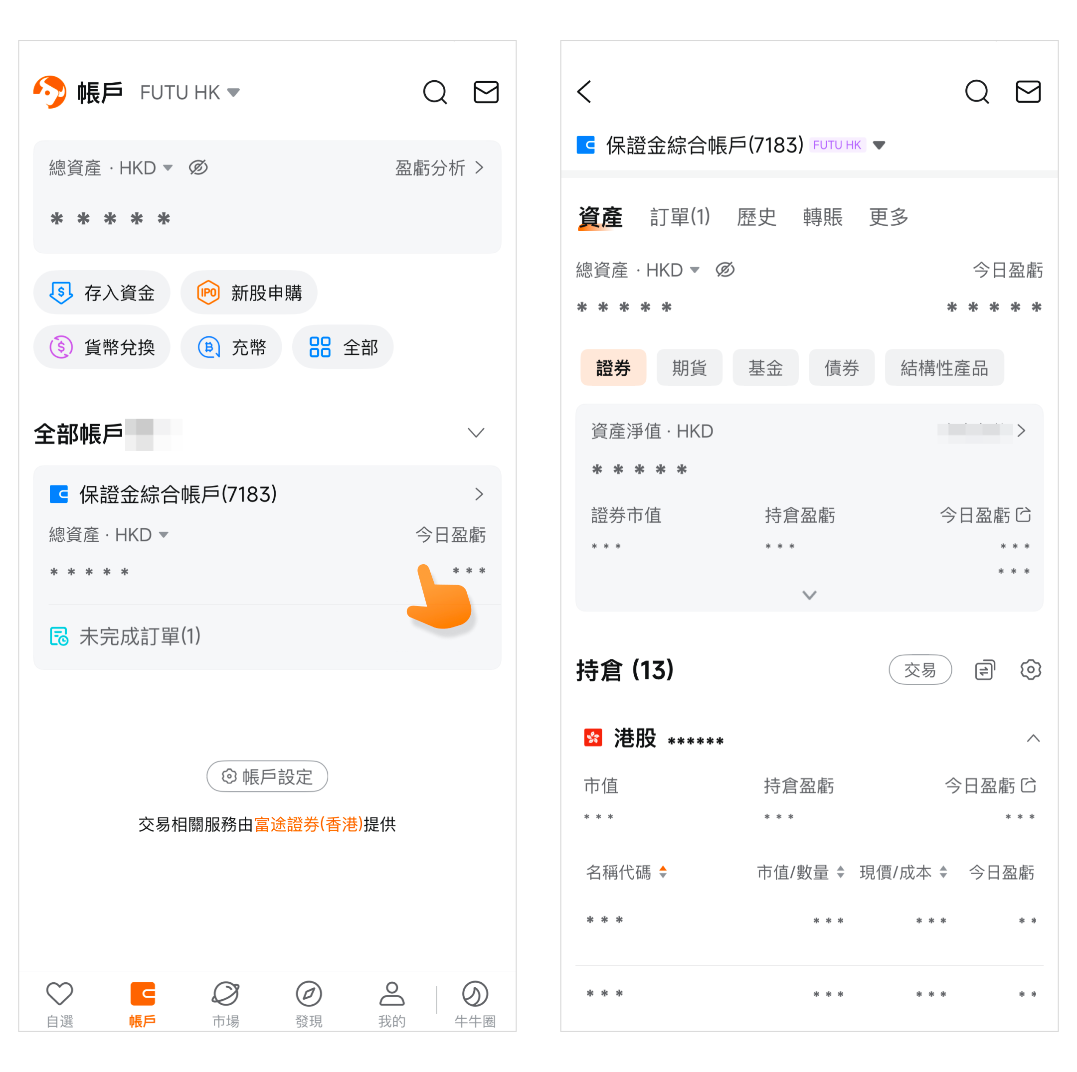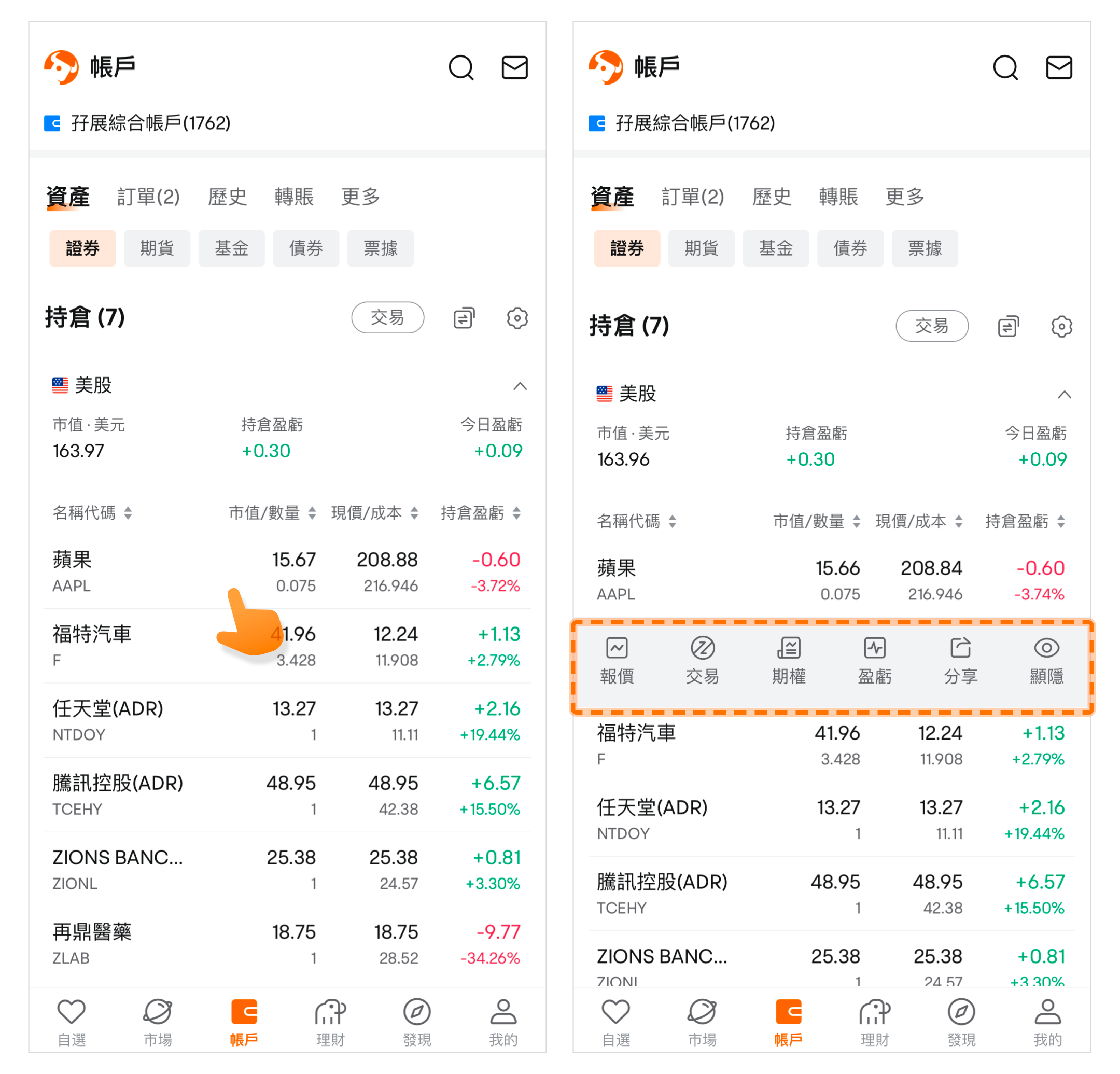 通过点击特定的股票资产,您还可以使用更多功能,如:报价、交易、期权、盈亏、分享和显隐。