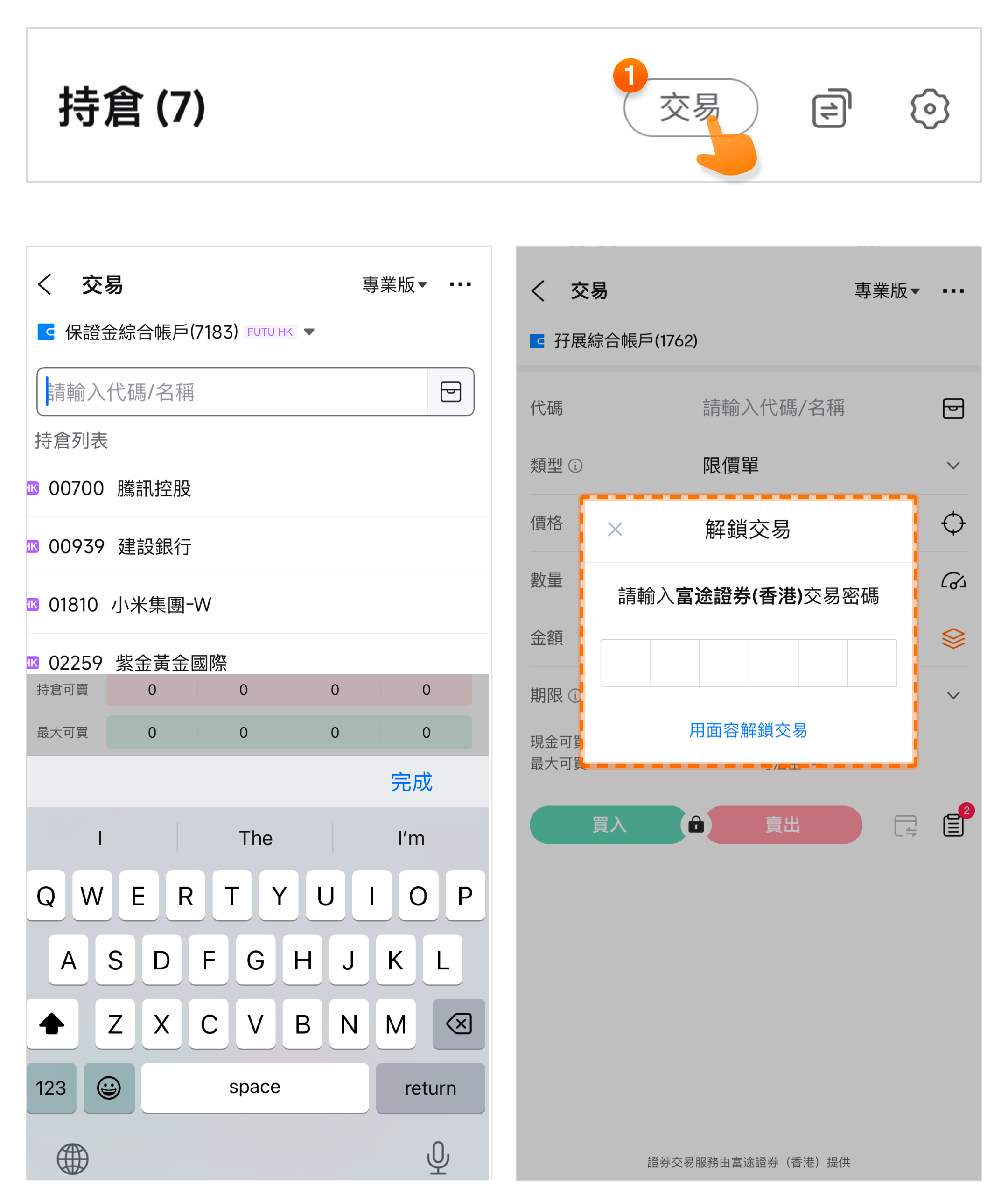 确认订单类型、价格、数量、金额及期限后,点击买入或卖出,输入您的富途证券交易密码即可完成操作。