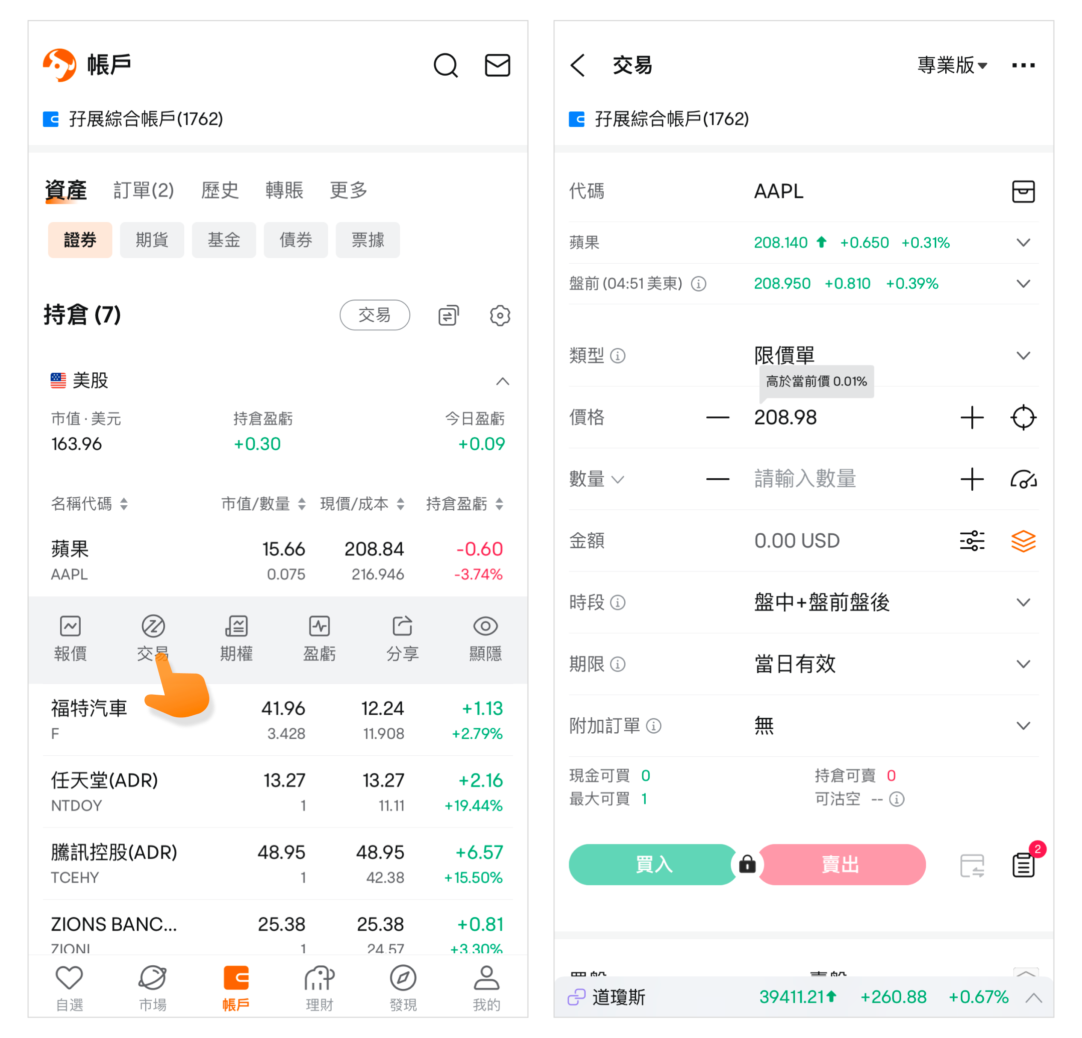 点击「交易」按钮,您可在此处直接买入或卖出该股票。