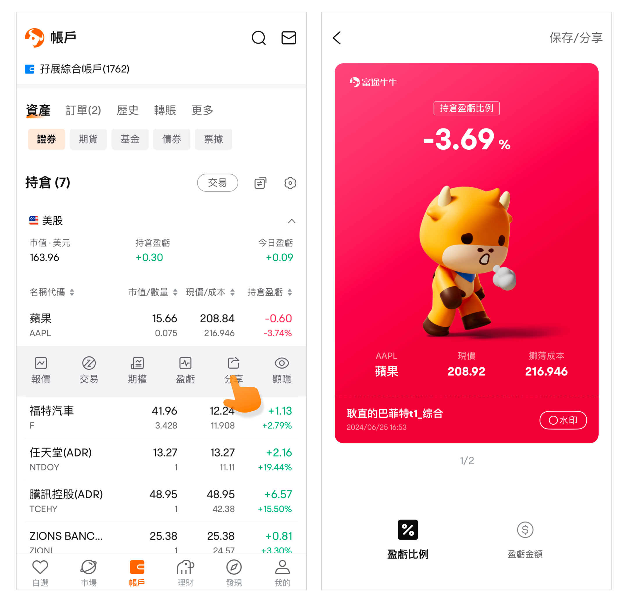 点击「分享」按钮,您还可以将该股票的盈亏比例或盈亏金额以图片的形式分享给您的朋友或社交媒体。
