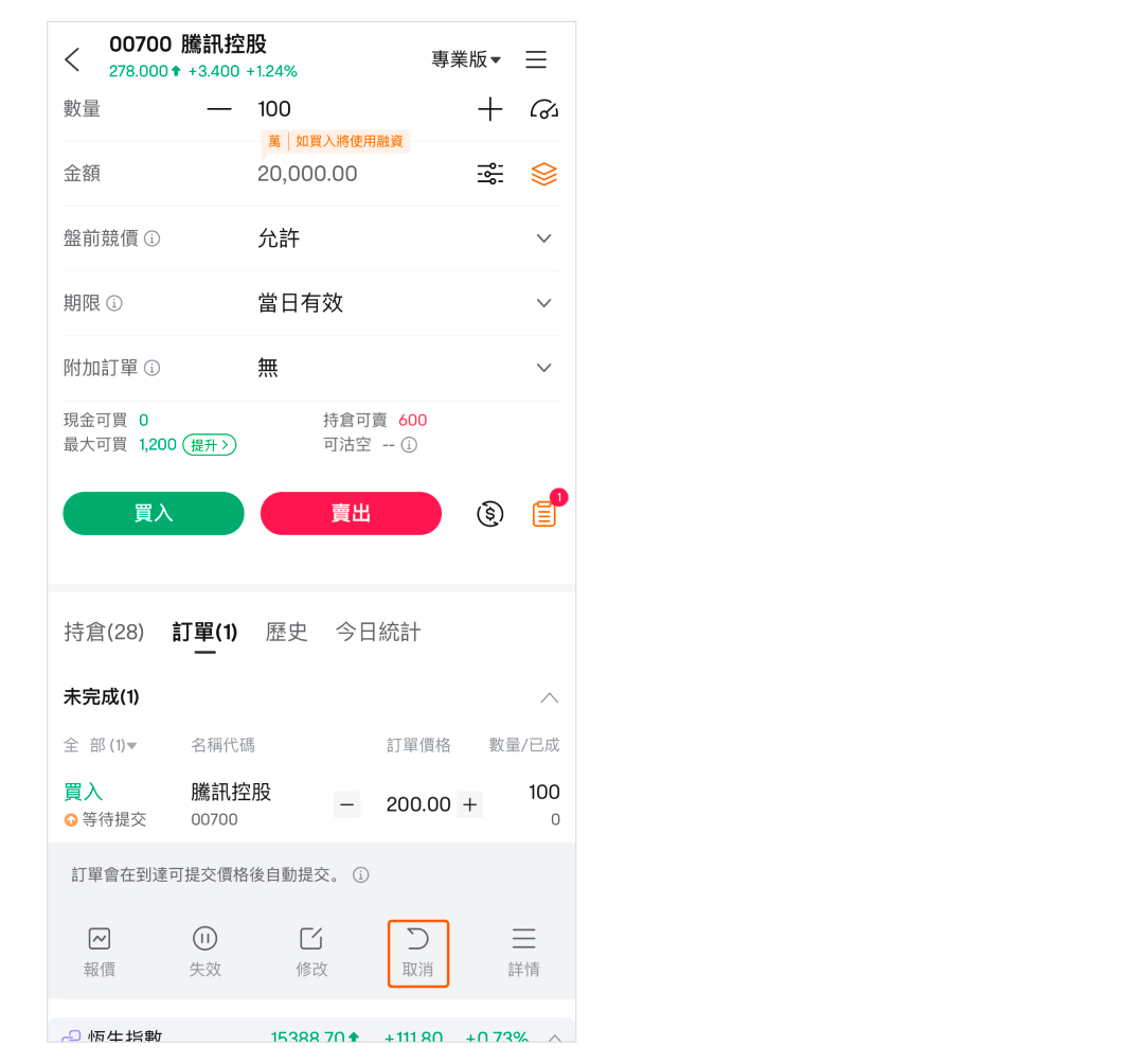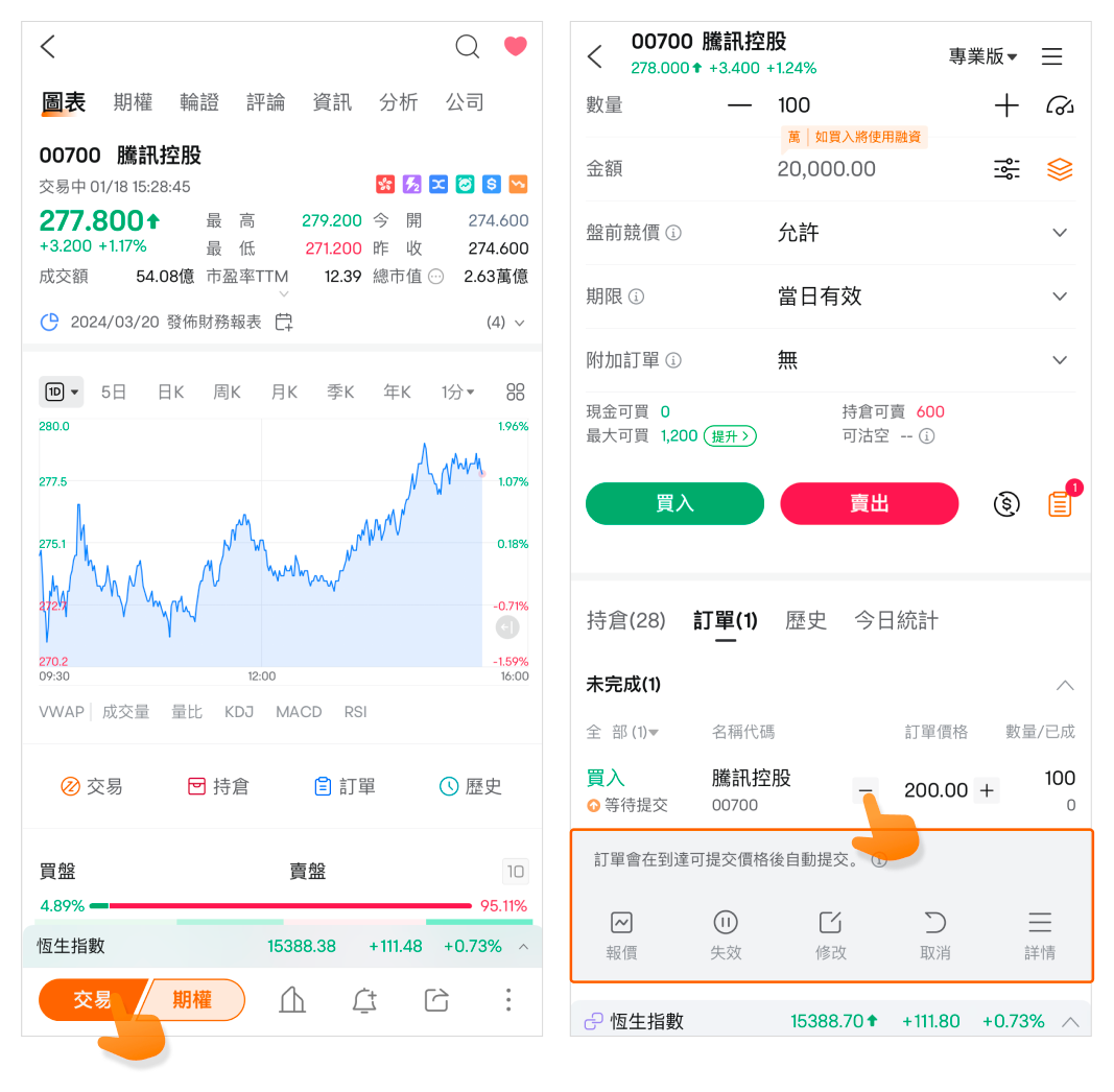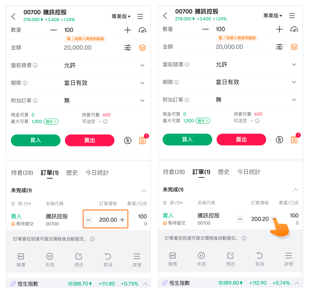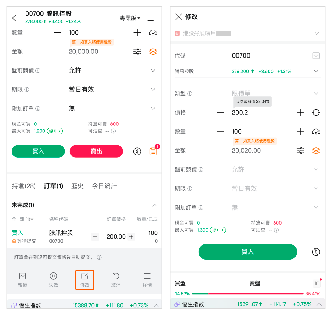 下单之后,如果发现价位变更迅速,临时想修改交易价格或买入更心仪的价格,可以通过「修改」按钮,也可直接按价格旁的「+/-」按钮来修正价格,以把握更多投资机会或避免交易错过最佳买卖时机。
