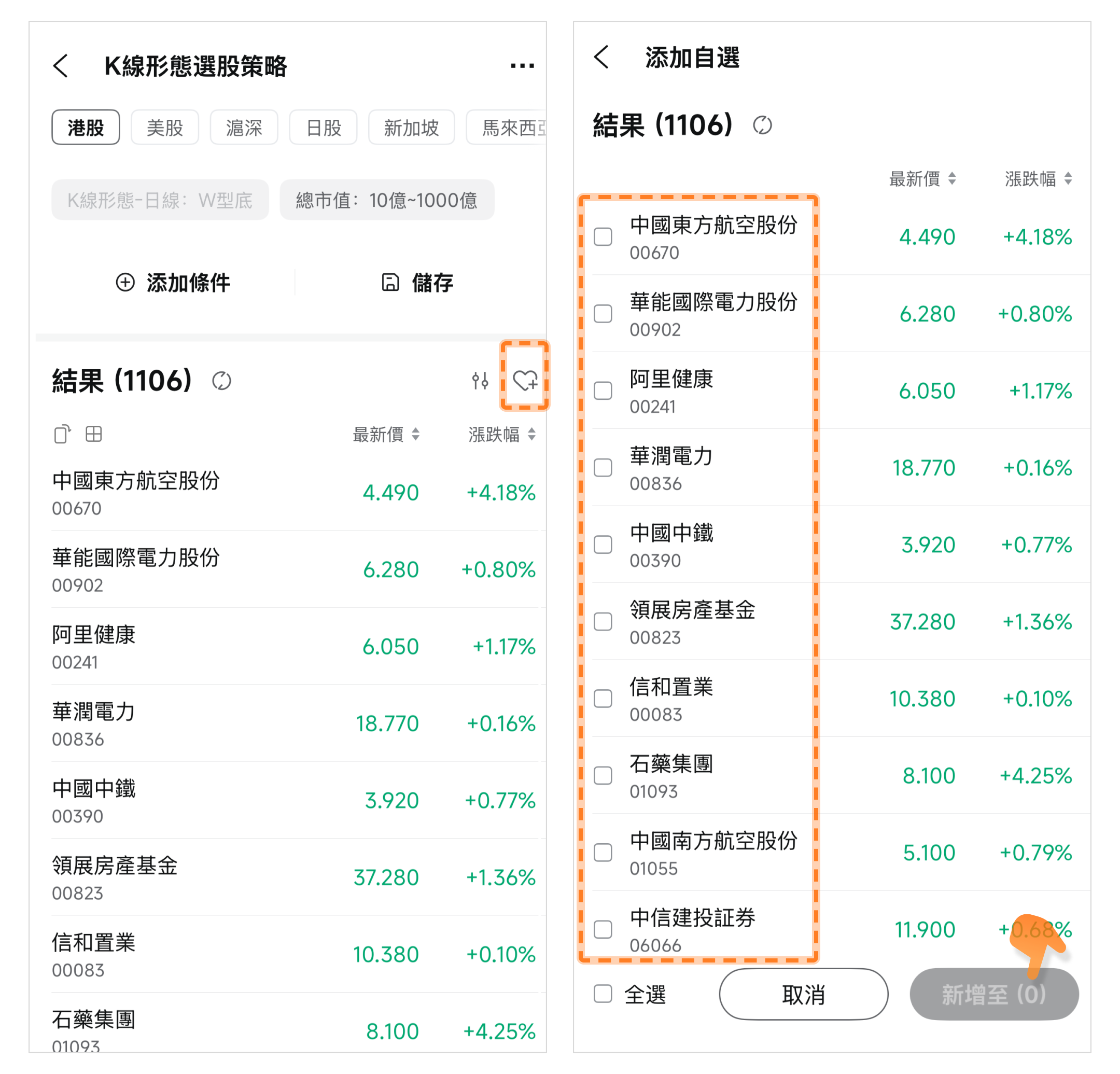 点击红心图标可将股票加入自选清单。
