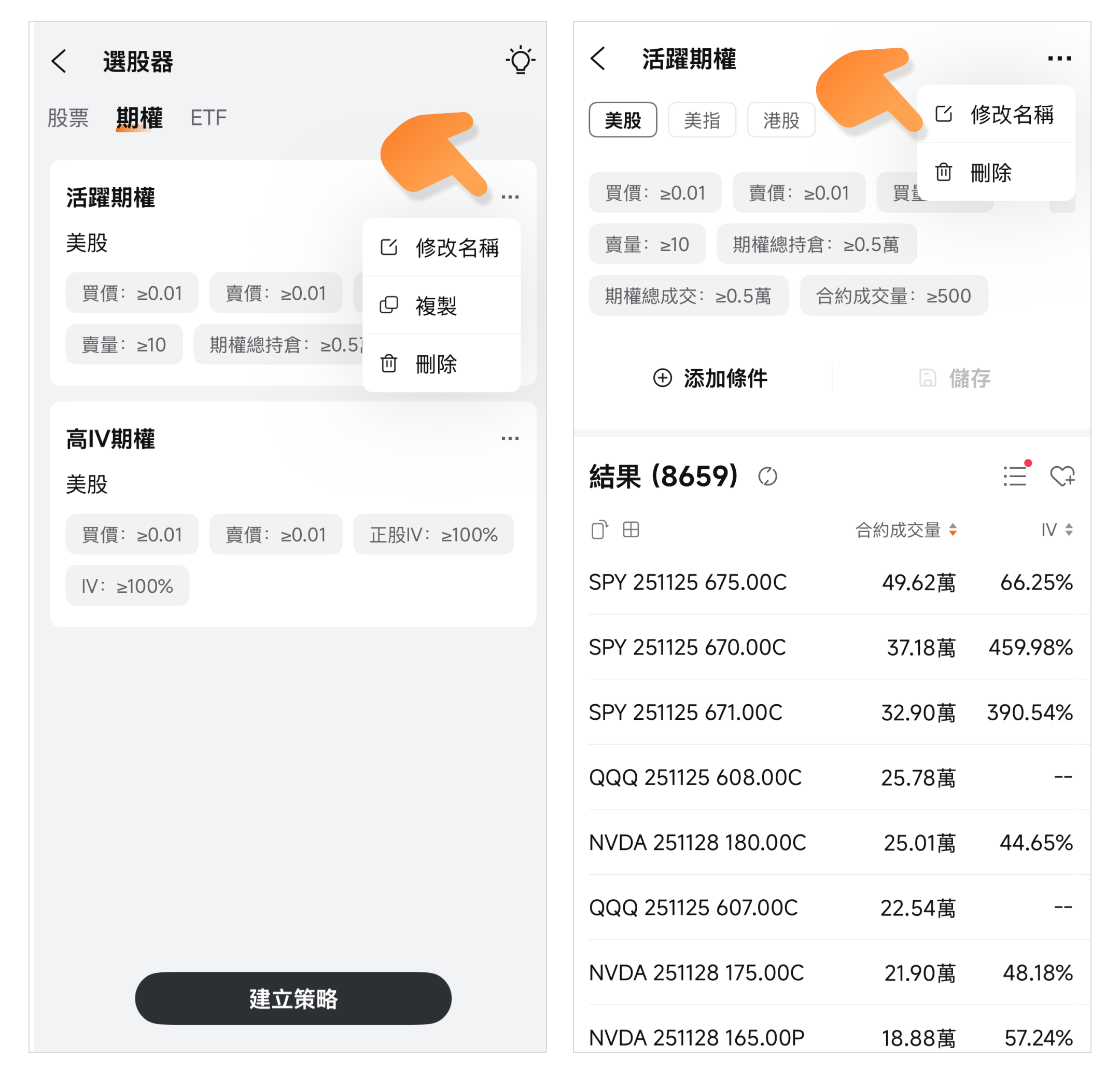 供股票、期权、ETF三类筛选功能,可通过顶部菜单切换。以下以股票为例说明操作步骤: