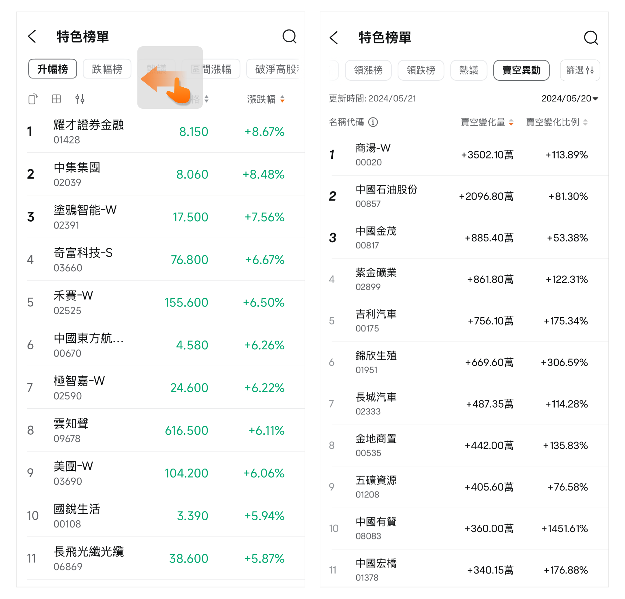 上方的榜单类型涵盖区间涨幅、领涨榜、领跌榜、热议、卖空异动等多种类型。