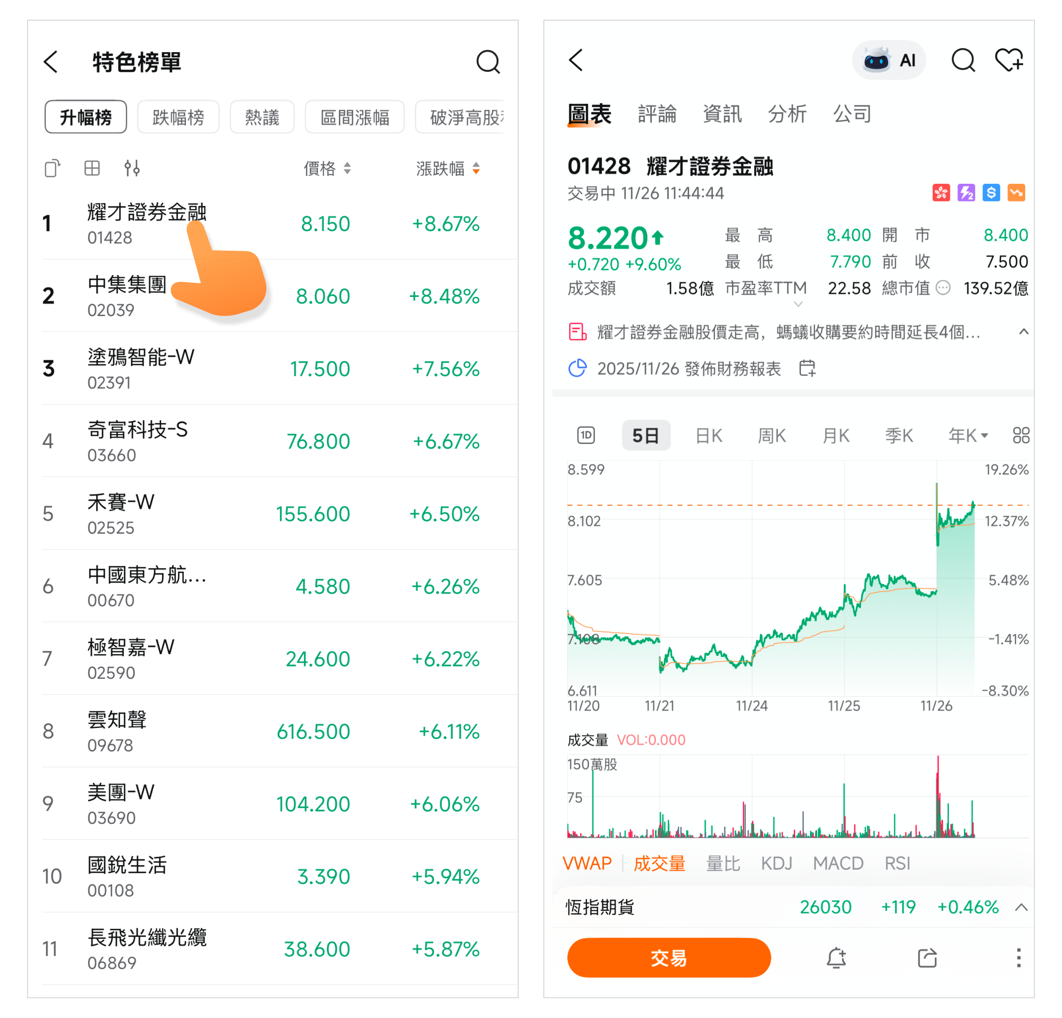 该功能模块由上方的榜单类型和下方的数据图表组成。您可以通过上方的榜单类型来选择符合您需求的股票榜单,下方显示的数据会根据您的选择而变动。另有横屏显示功能供您选择。