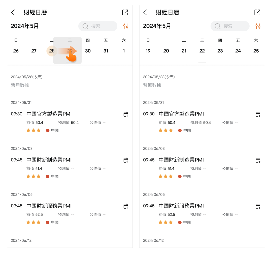 上方的日期时间轴默认向您展示当天所在周的时间,您可通过左右滑动时间轴或直接点击日期来查看过往或未来的经济指标信息。