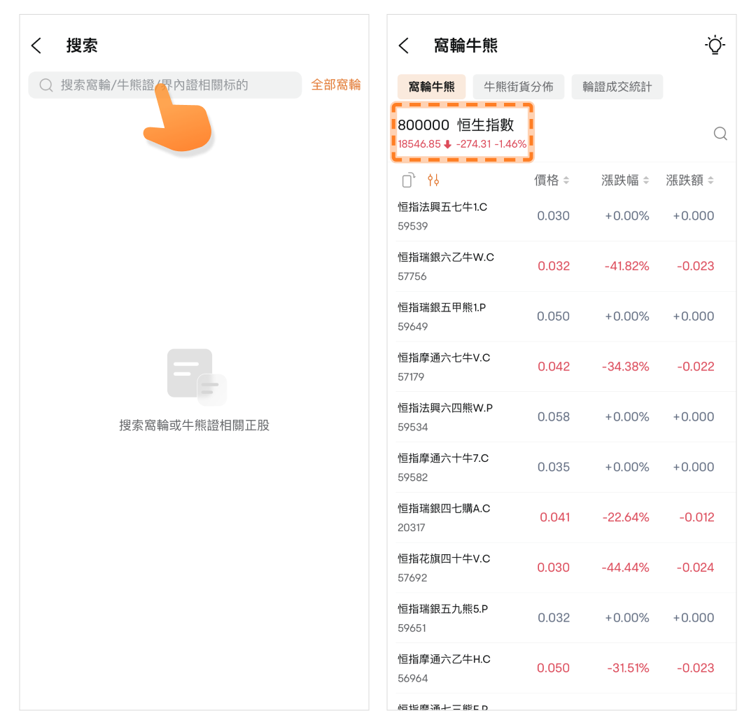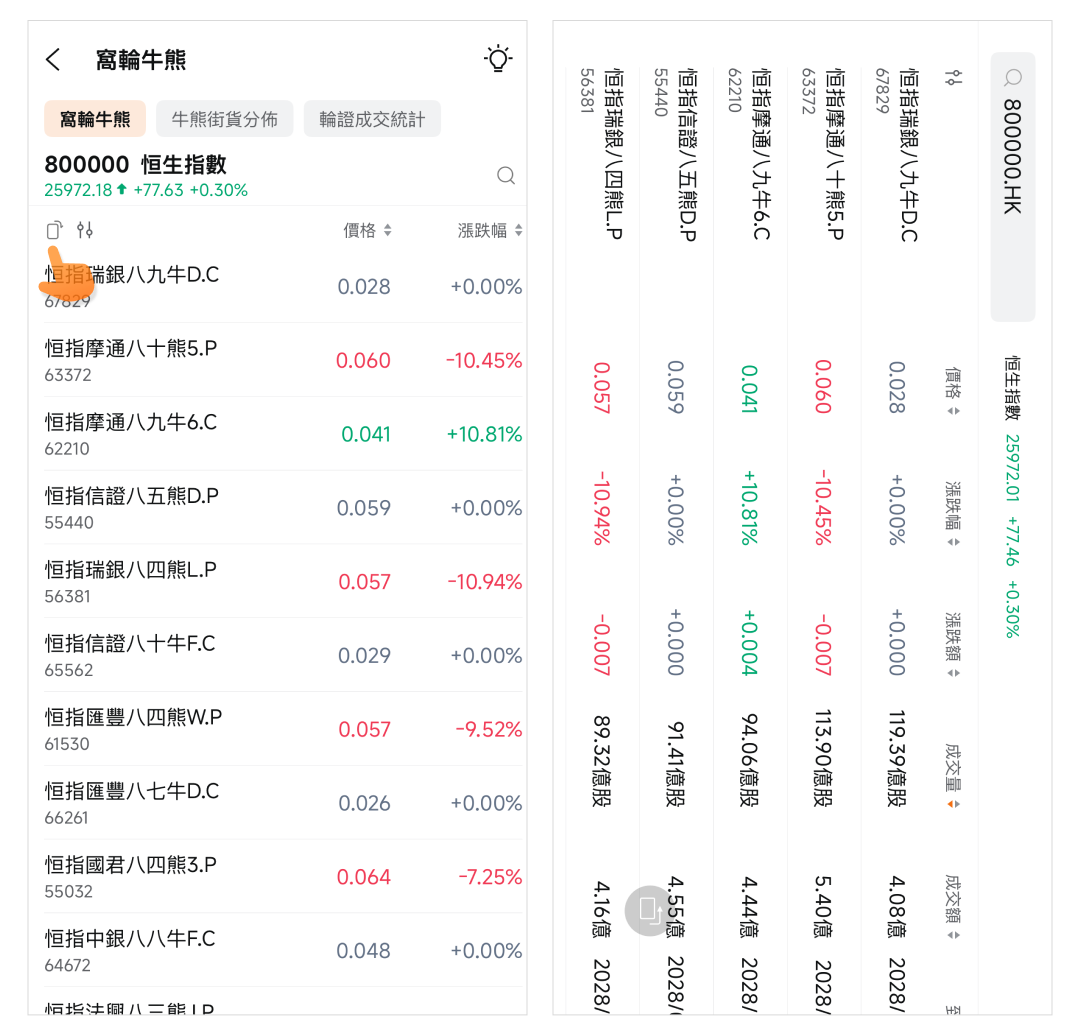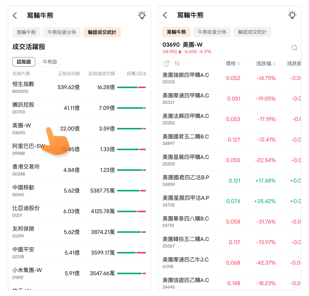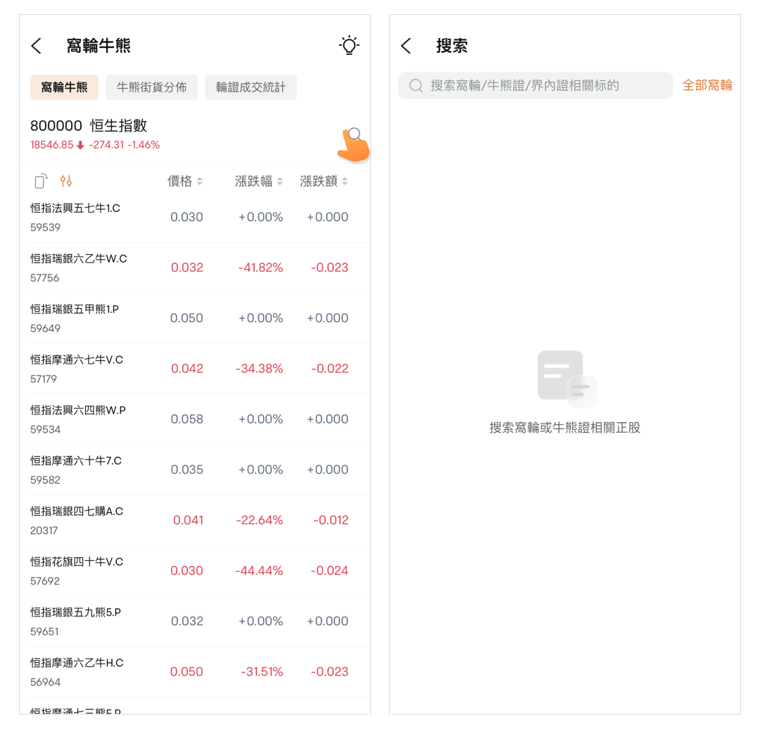 路径:市场页>港股>亮点工具>窝轮牛熊。