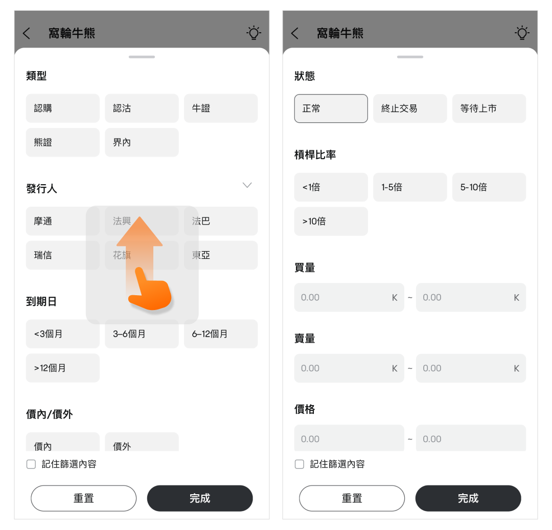 筛选器涵盖类型、发行人、到期日、杠杆比率等多维度筛选,可方便您更精准地定位到符合您需求的窝轮牛熊。