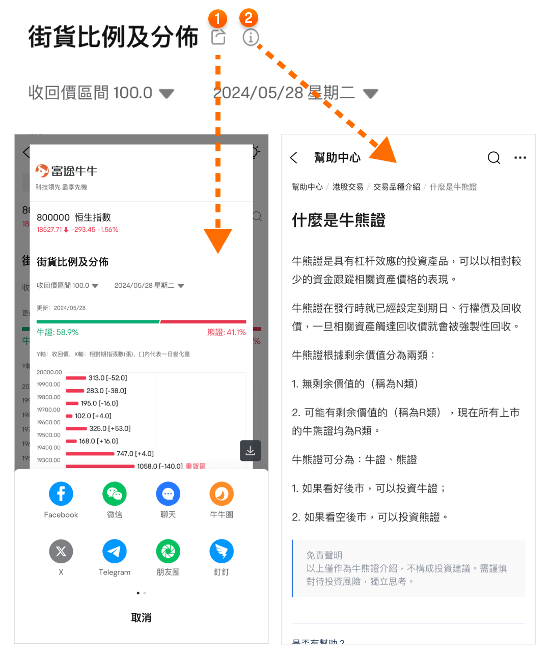 「窝轮牛熊」页的第二个子功能模块是,牛熊街货分布,该功能向您展示市场上街货比例及分布。通过点击「街货比例及分布」文字下方的设置收回价区间和日期,您可筛选查看符合您需求的市场情况。
