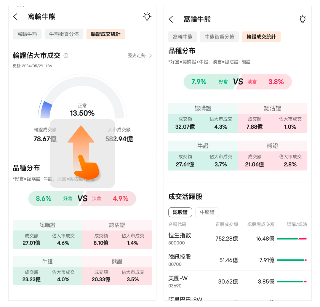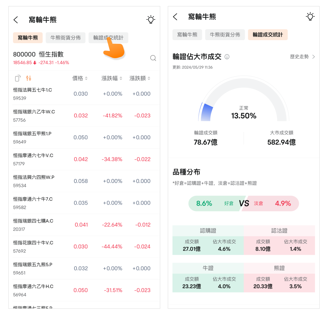 路径:市场页>港股>亮点工具>窝轮牛熊>顶部筛选器>论证成交统计。