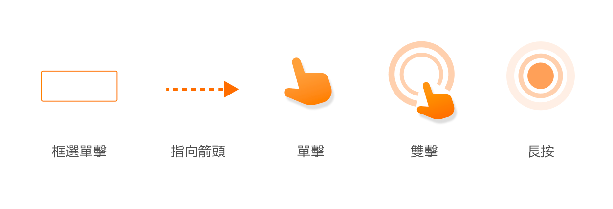 b. 手勢序號,包括框選、點擊/雙擊、放大/縮小、上下左右划動等操作。