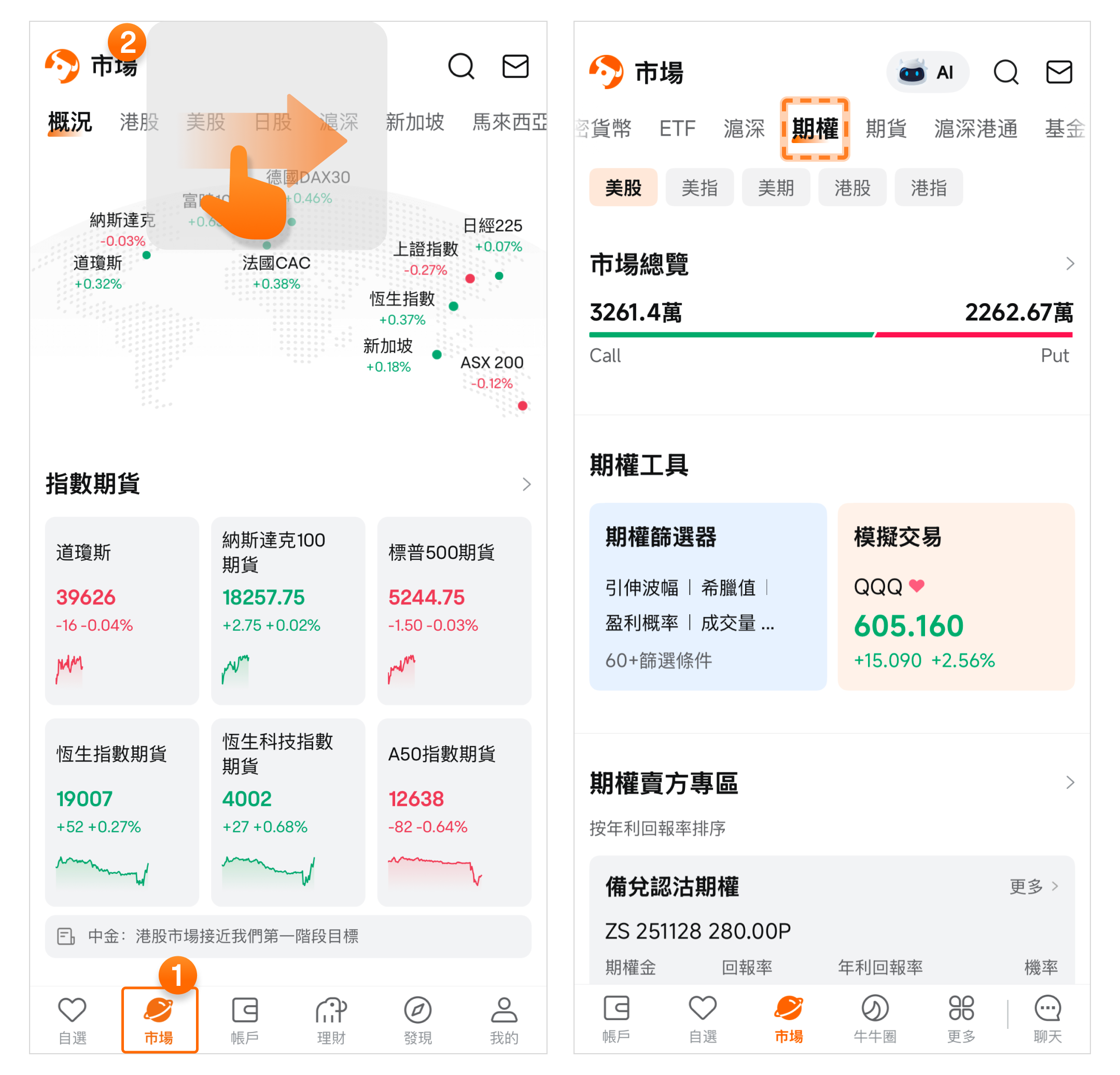 富途牛牛提供了丰富的市场品类服务,涵盖期权、期货、ETF、基金、债券、外汇等主要投资品种,您可通过滑动顶部菜单栏来选择您所需要进行交易的市场品类。