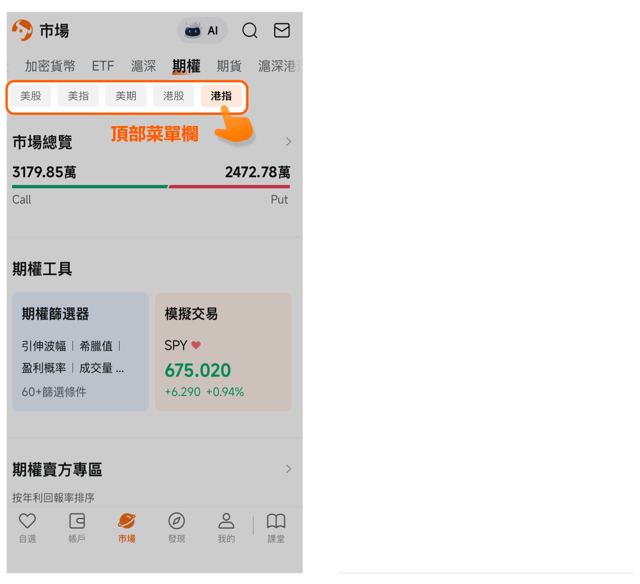 1、「期权」页面的第一个子功能模块,是顶部菜单栏,您可以在此处选择需要查看的市场。若要深入了解,请点击所需了解的市场品类,如「港指」。
