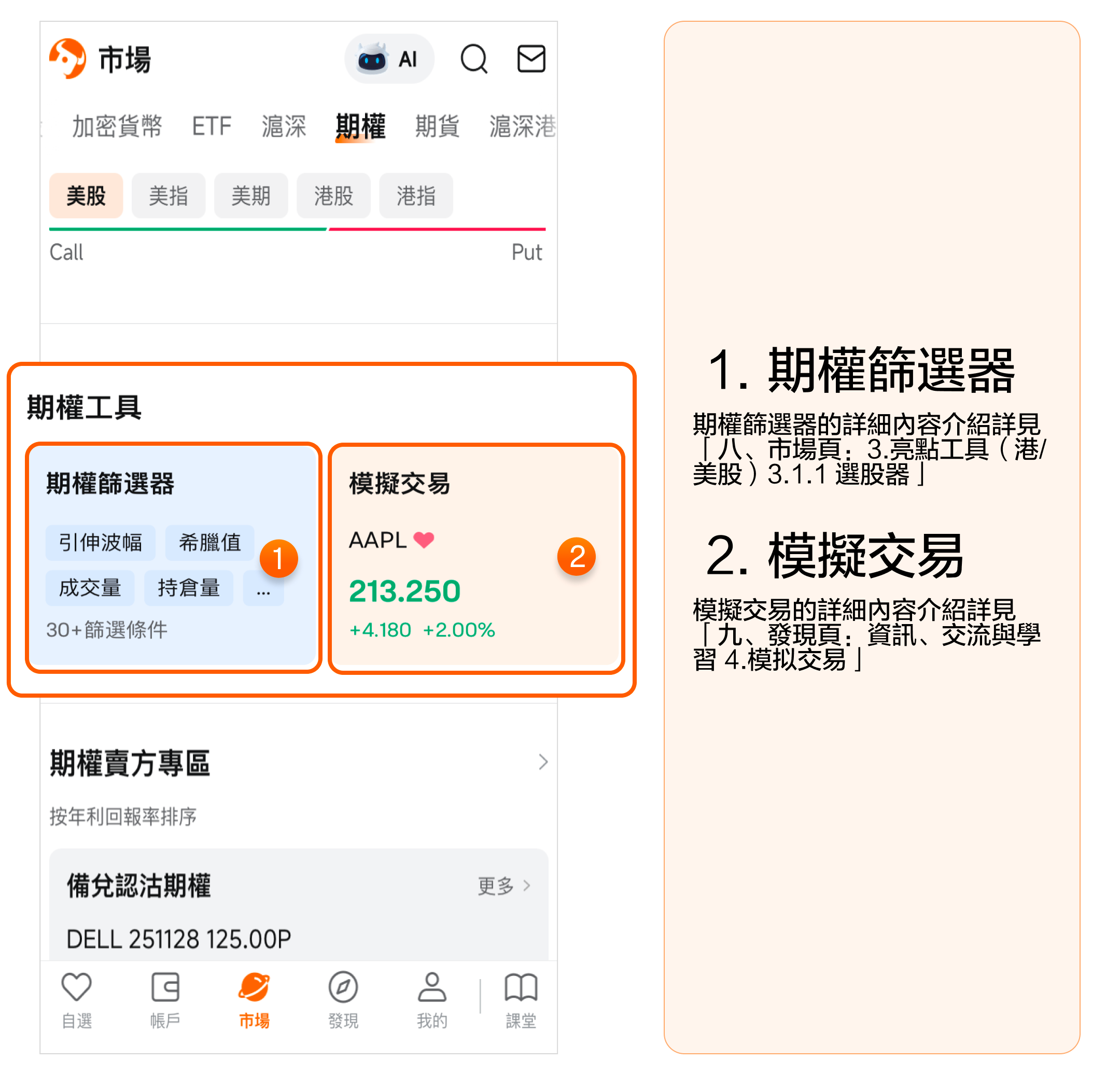 其中期权筛选器的详细内容介绍详见「八、市场页:3.亮点工具(港/美股)3.1.1选股器」;模拟交易的详细内容介绍详见「九、发现页:资讯、交流与学习4.模拟交易」