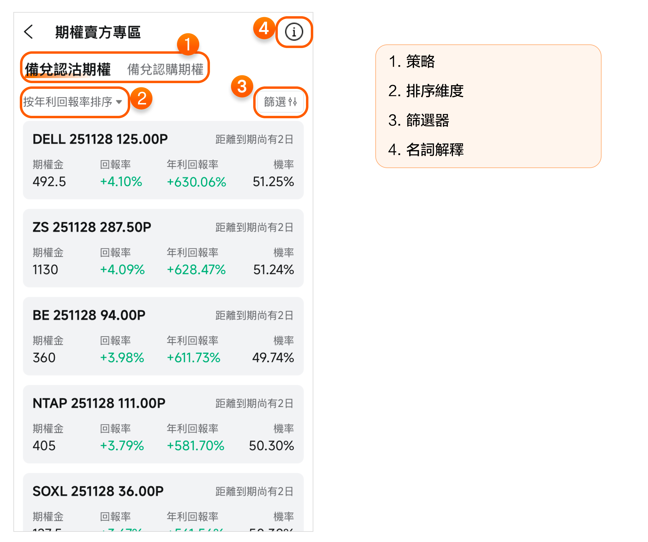 在「期权卖方专区」页面中,选择对应的策略后,可以按照年化回报率(高→低)、回报率(高→低)、权利金(高→低)、盈利概率(高→低)等几种方式进行排序,也可以通过股票范围、市值、业绩发布时间等股票特性,或是到期类型、到期天数、期权金、价外程度、隐含波动率等期权特性进行筛选。点击右上角的i,还可以获得更多名词解释。