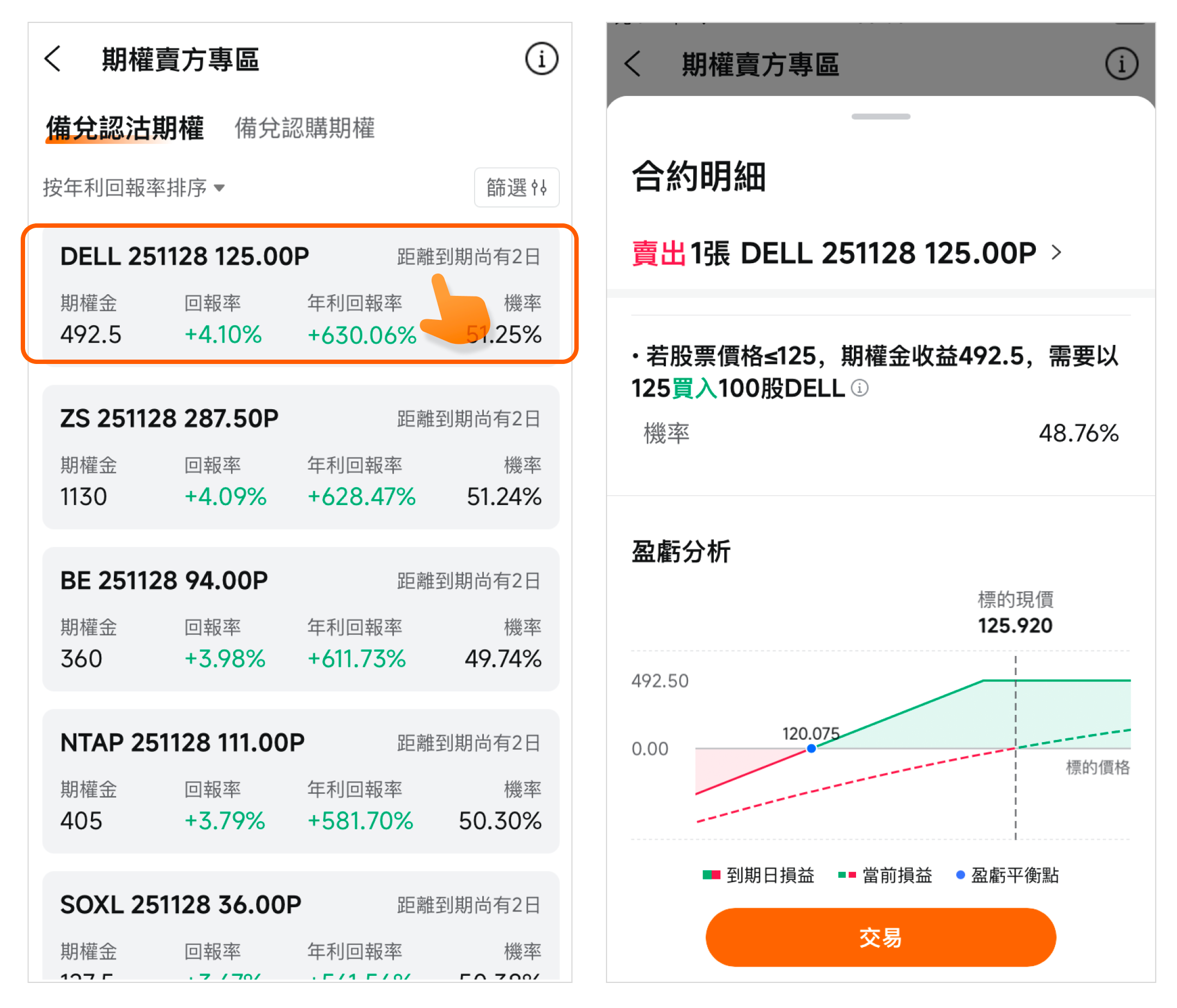 4、「期权」页的第四个子功能模块,是期权卖方专区,该模块按年利回报率展示了备兑认沽期权、备兑认购期权两种策略的期权标的。
