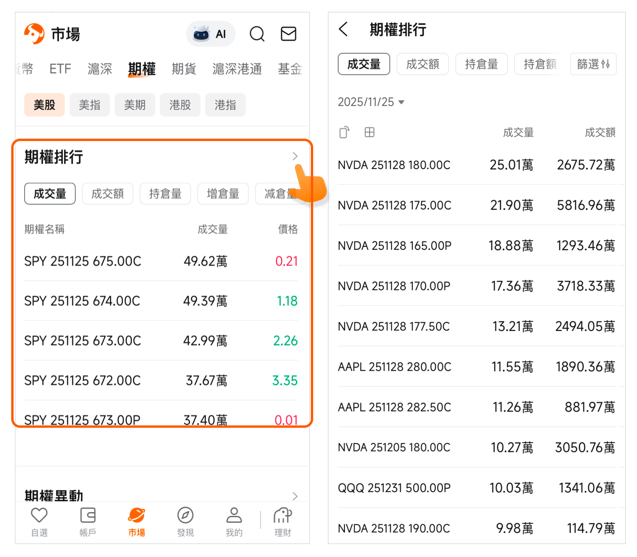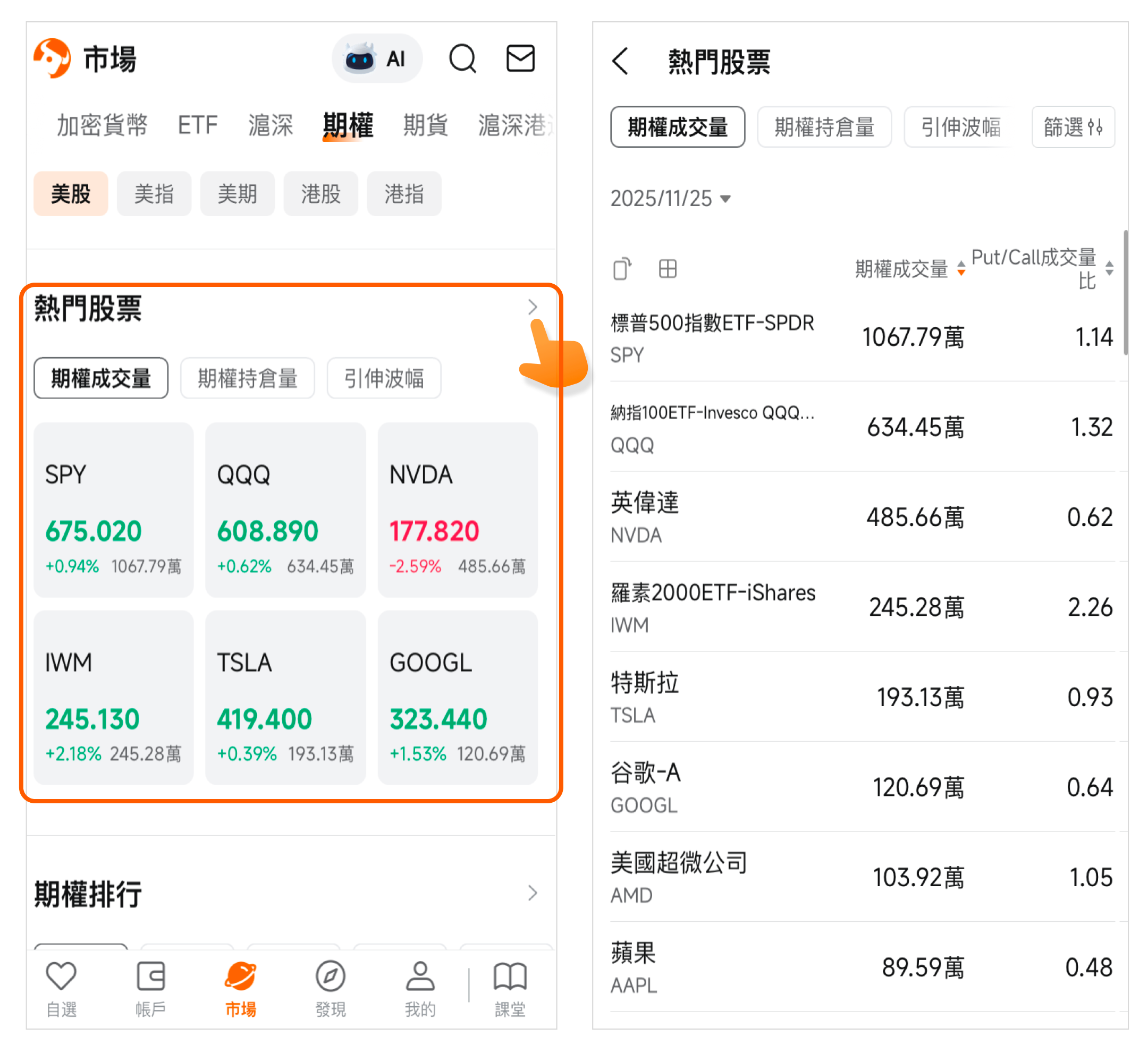 路径:市场页>顶部菜单栏>期权>热门股票。
