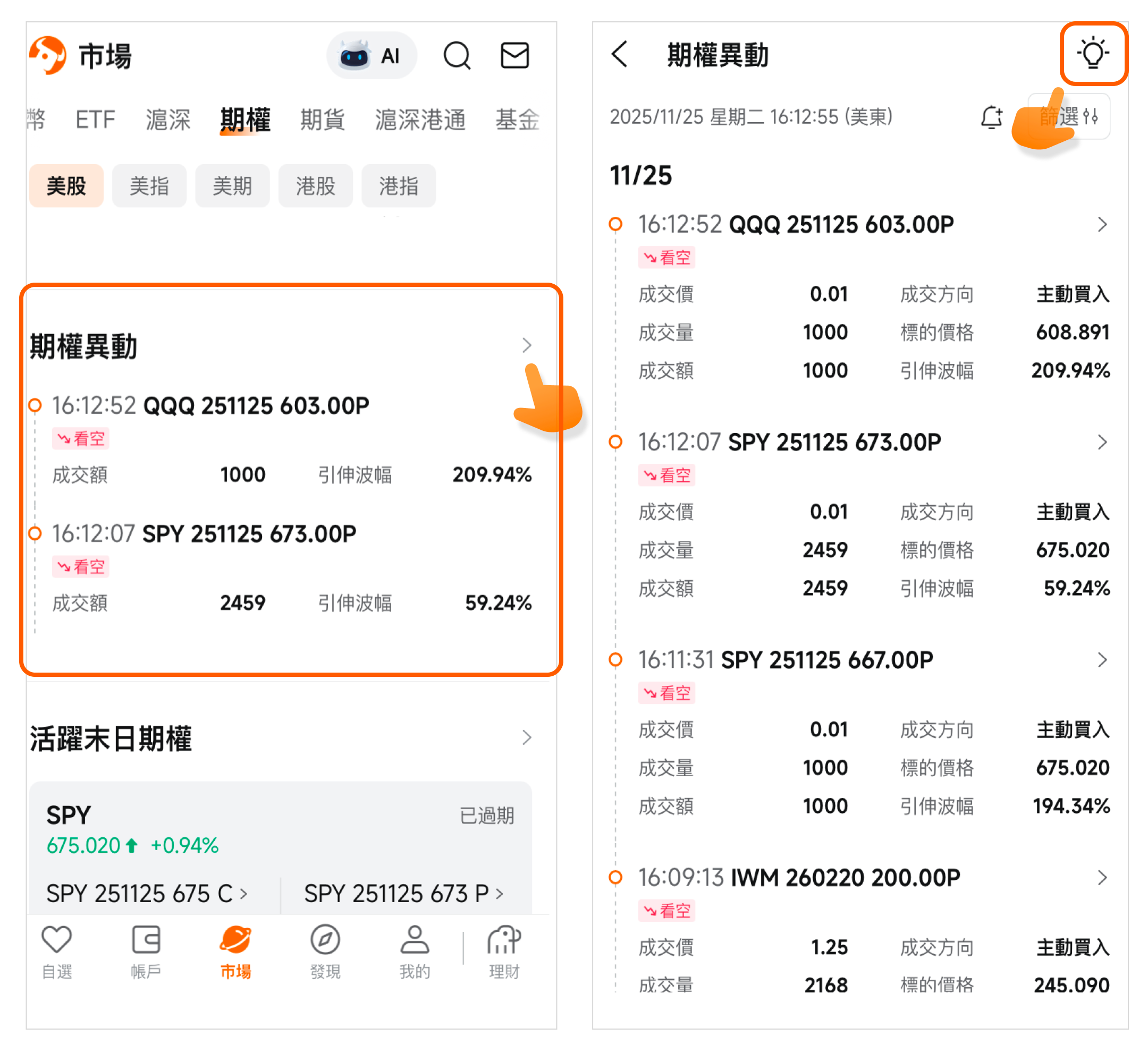 如需深入了解,请点击「>」查看期权异动详情页。详情页介绍见「七、报价页:3.期权3.4期权异动」。在详情页中点击右上方的小灯泡,也可获取关于期权异动的更多知识讲解。