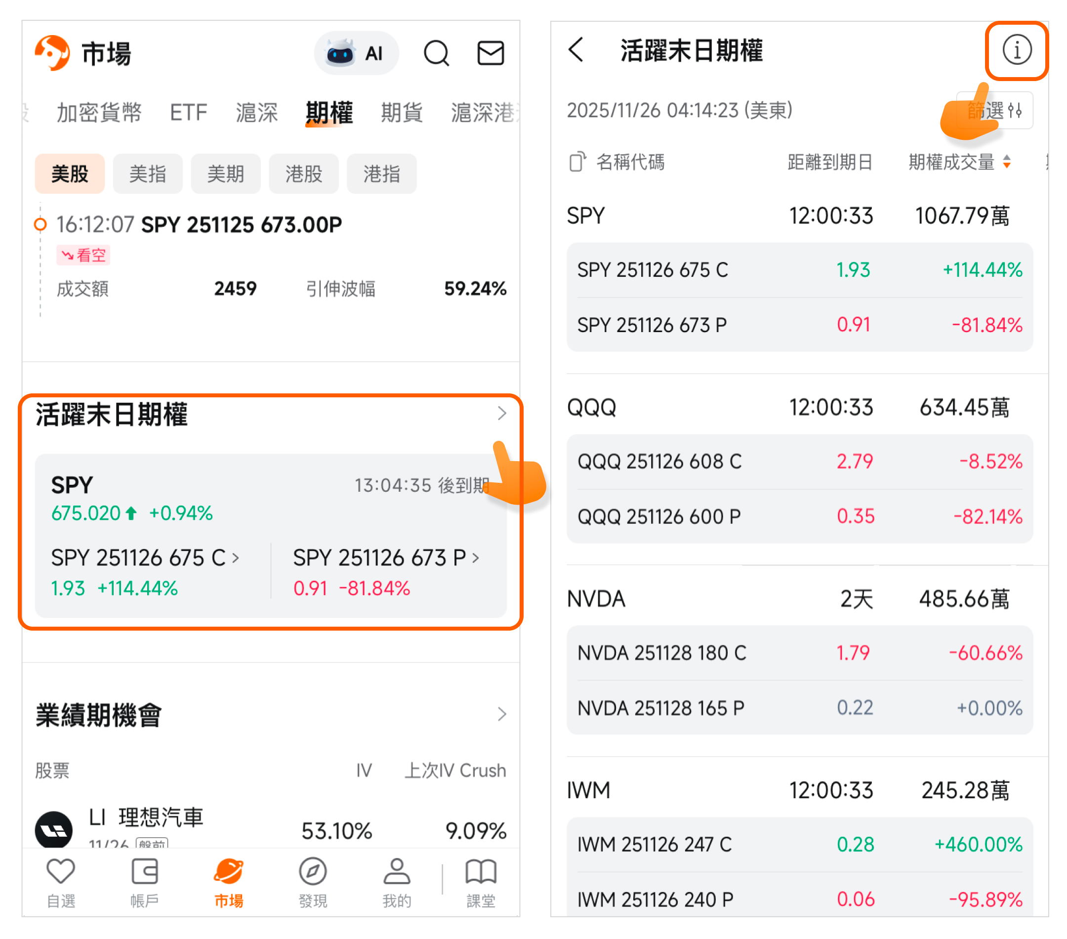 如需深入了解,请点击「>」查看活跃末日期权详情页。在详情页中点击右上方的i,还可获取关于末日期权的更多知识讲解。
