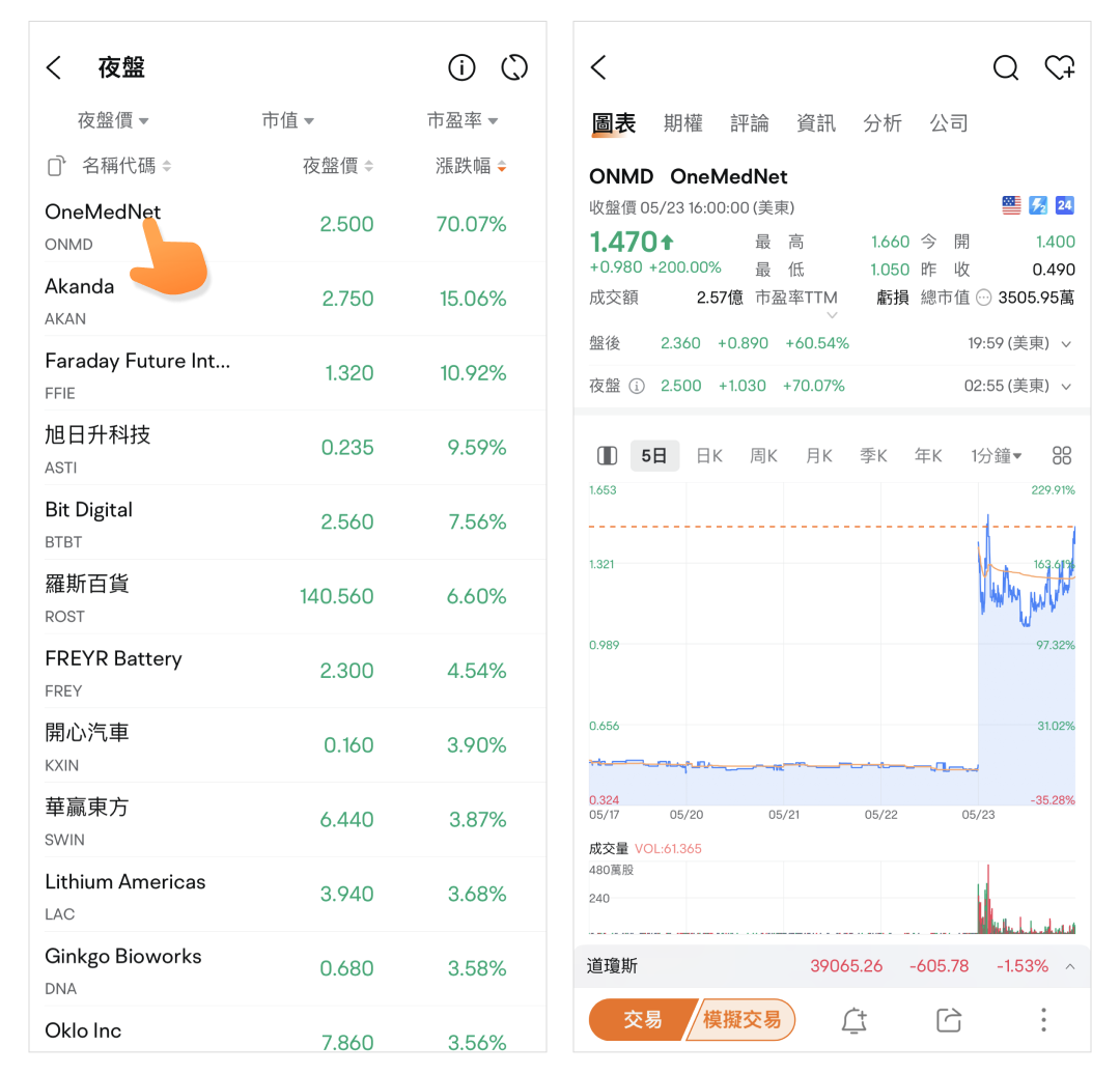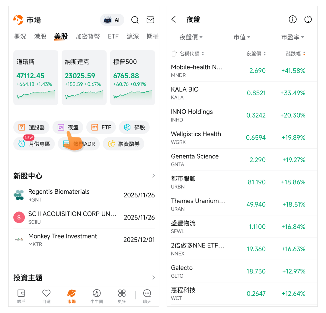 路径:市场页>美股>亮点工具>夜盘。