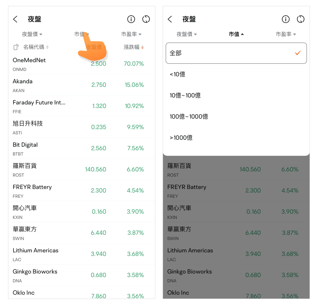 上方的筛选器涵盖夜盘价、市值、市盈率。