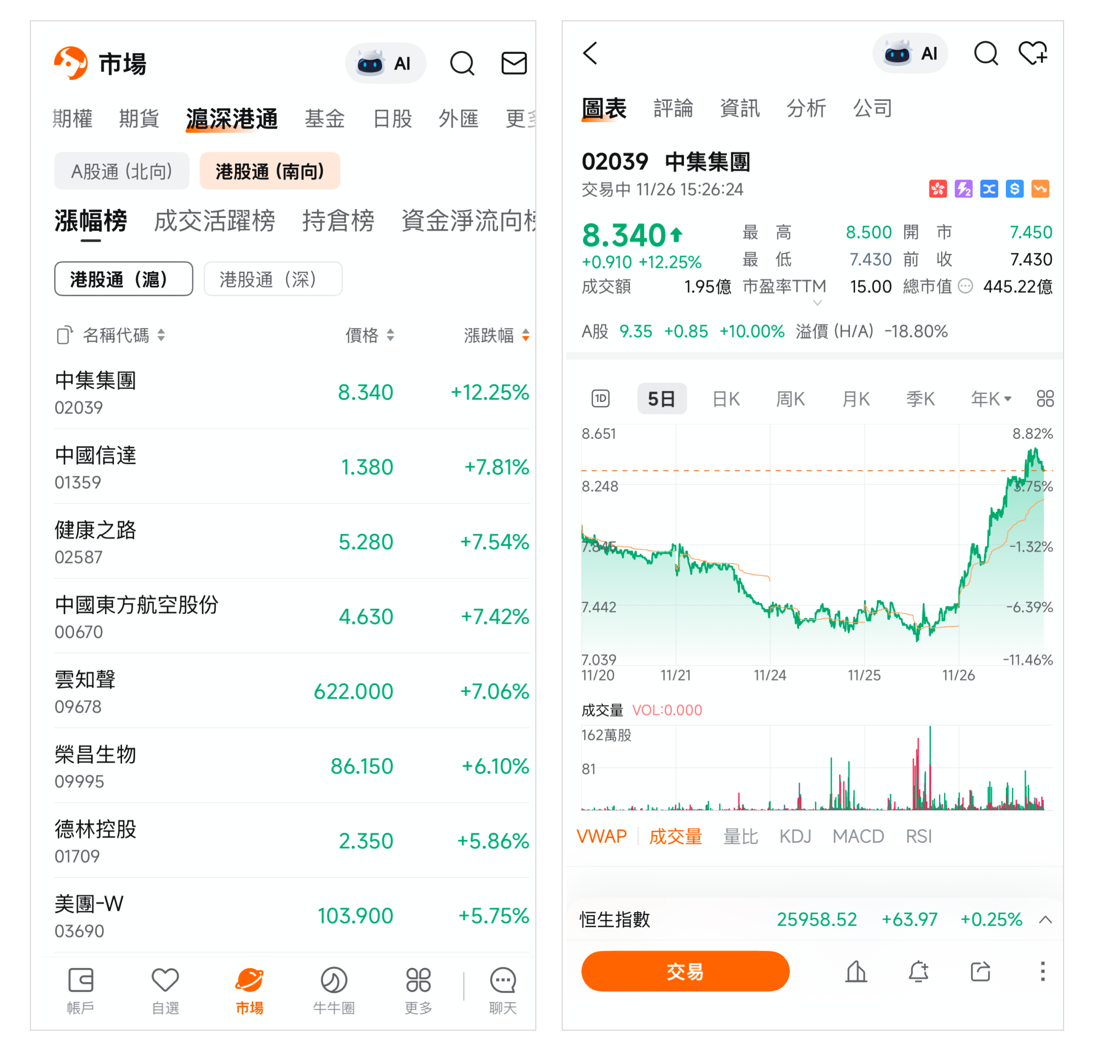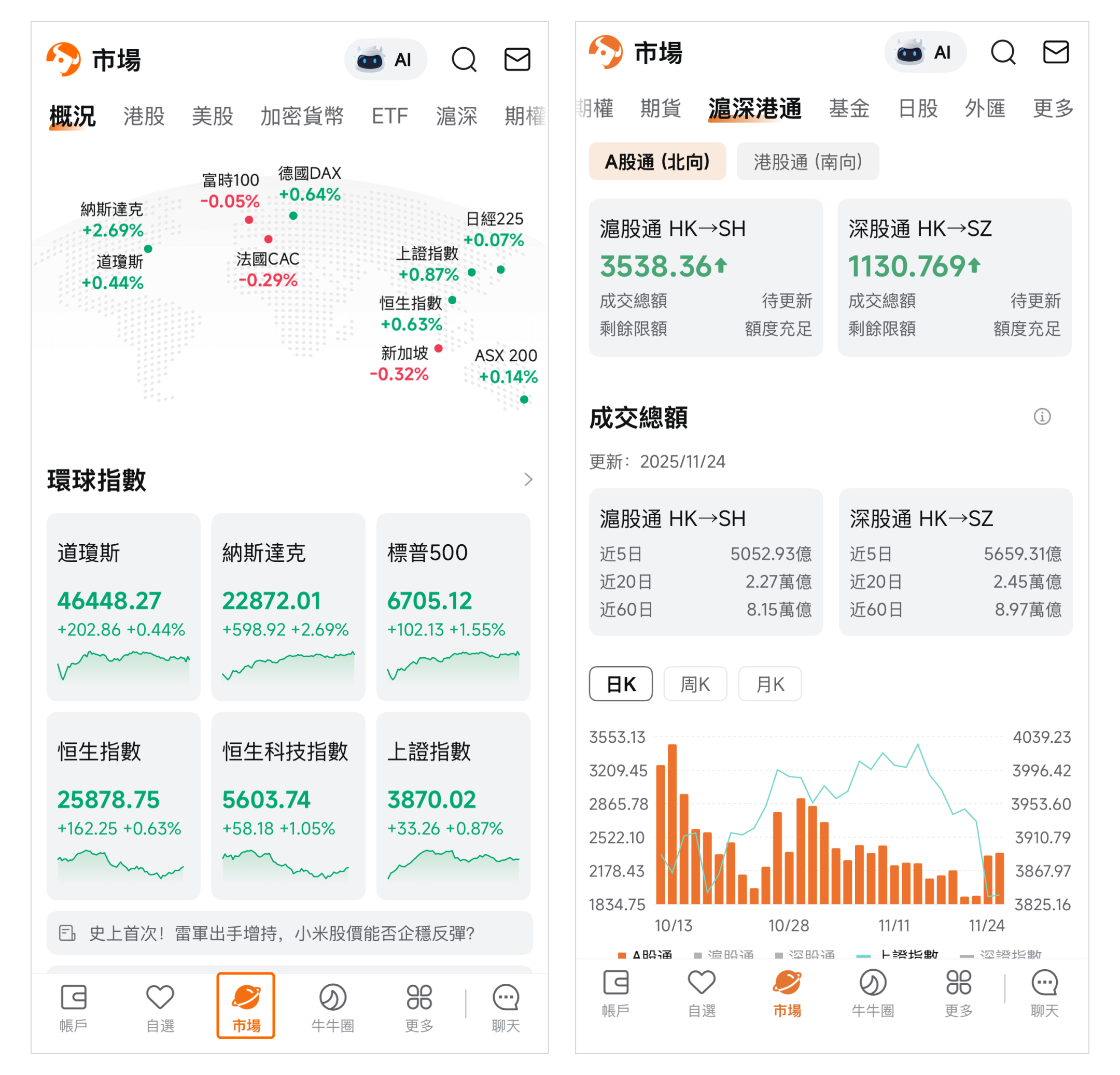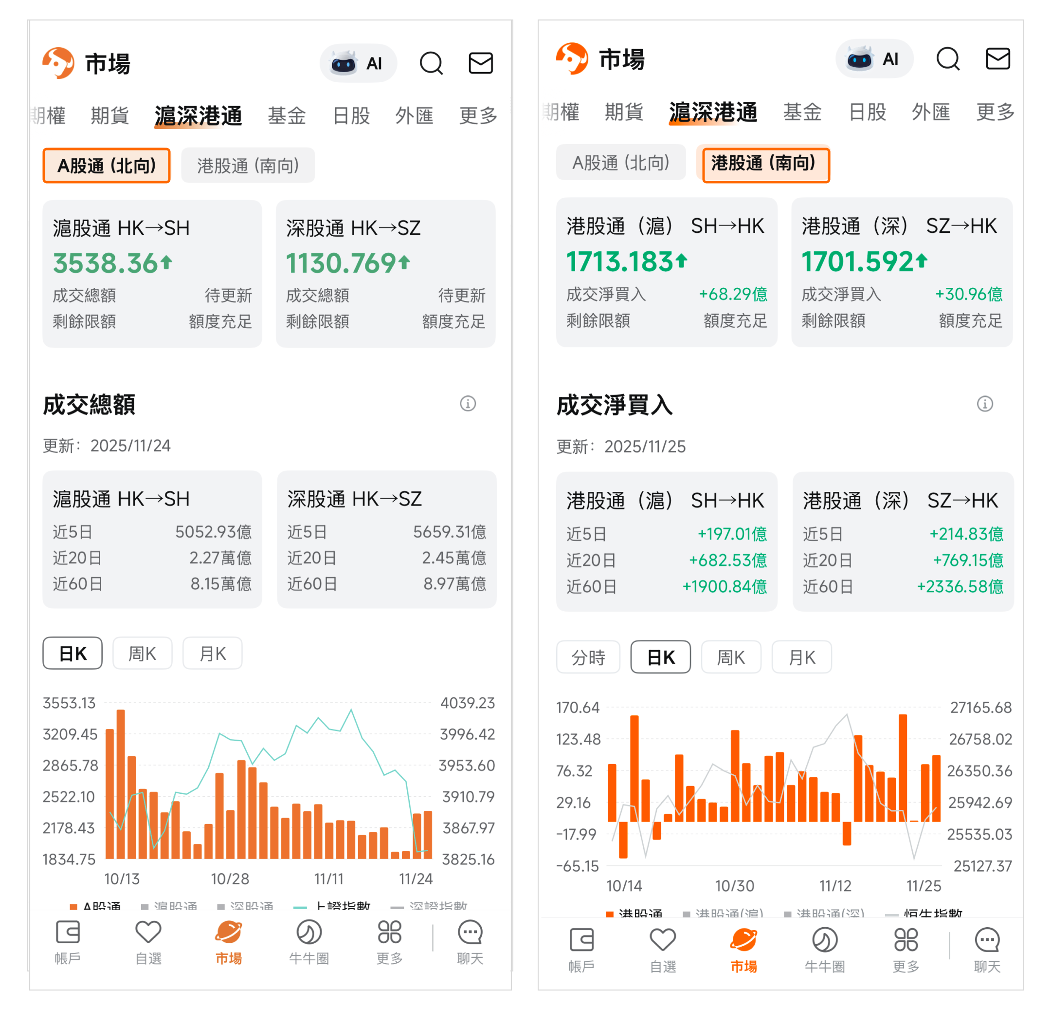 富途牛牛提供了沪深港通服务,具体包括A股通(北向)及港股通(南向)。其中A股通包括沪股通和深股通,是沪港通与深港通的北向交易部分。港股通包括港股通(沪)和港股通(深),是沪港通与深港通的南向交易部分。