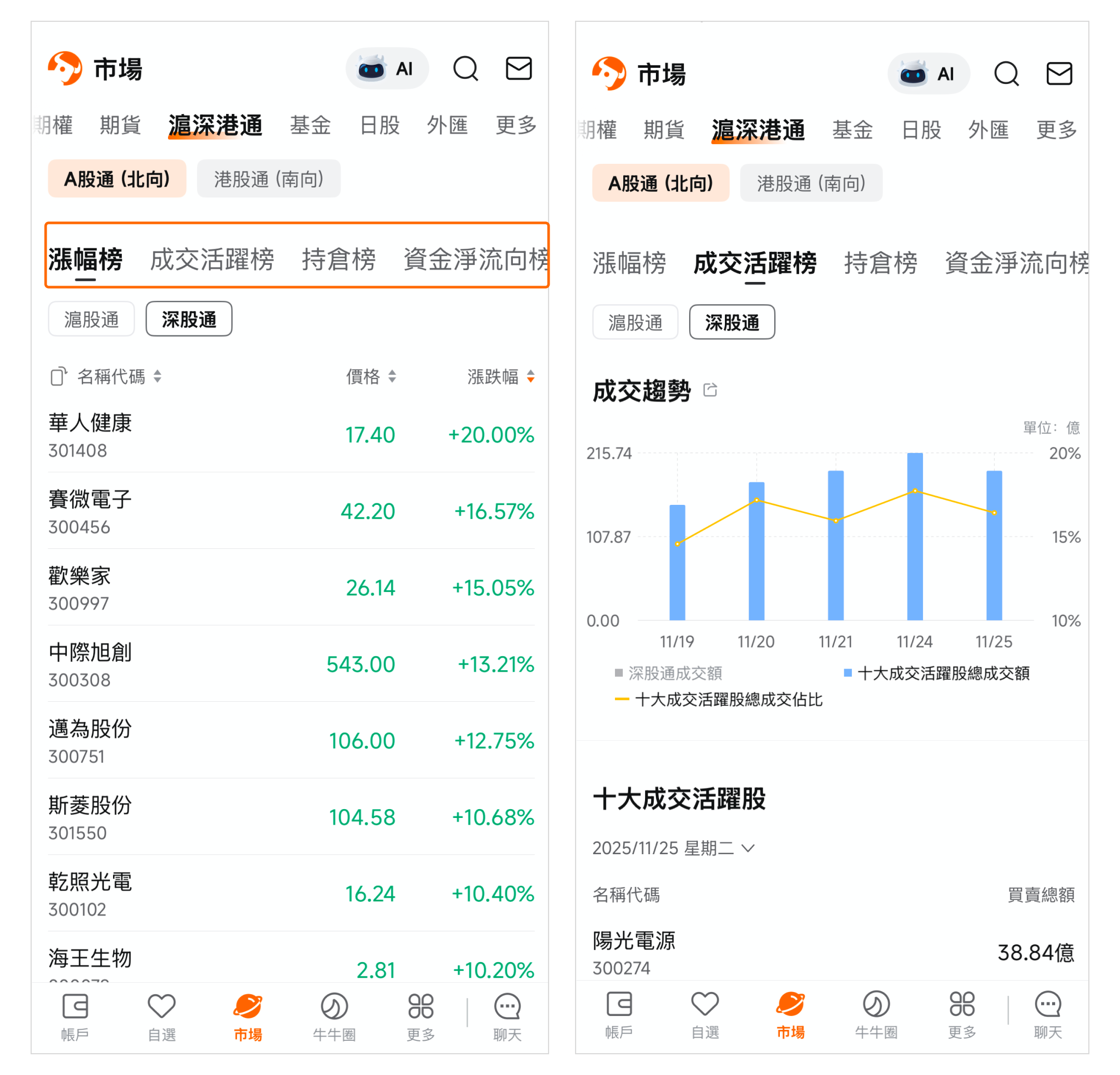路径:市场页>顶部菜单栏>沪深港通>各大榜单数据。