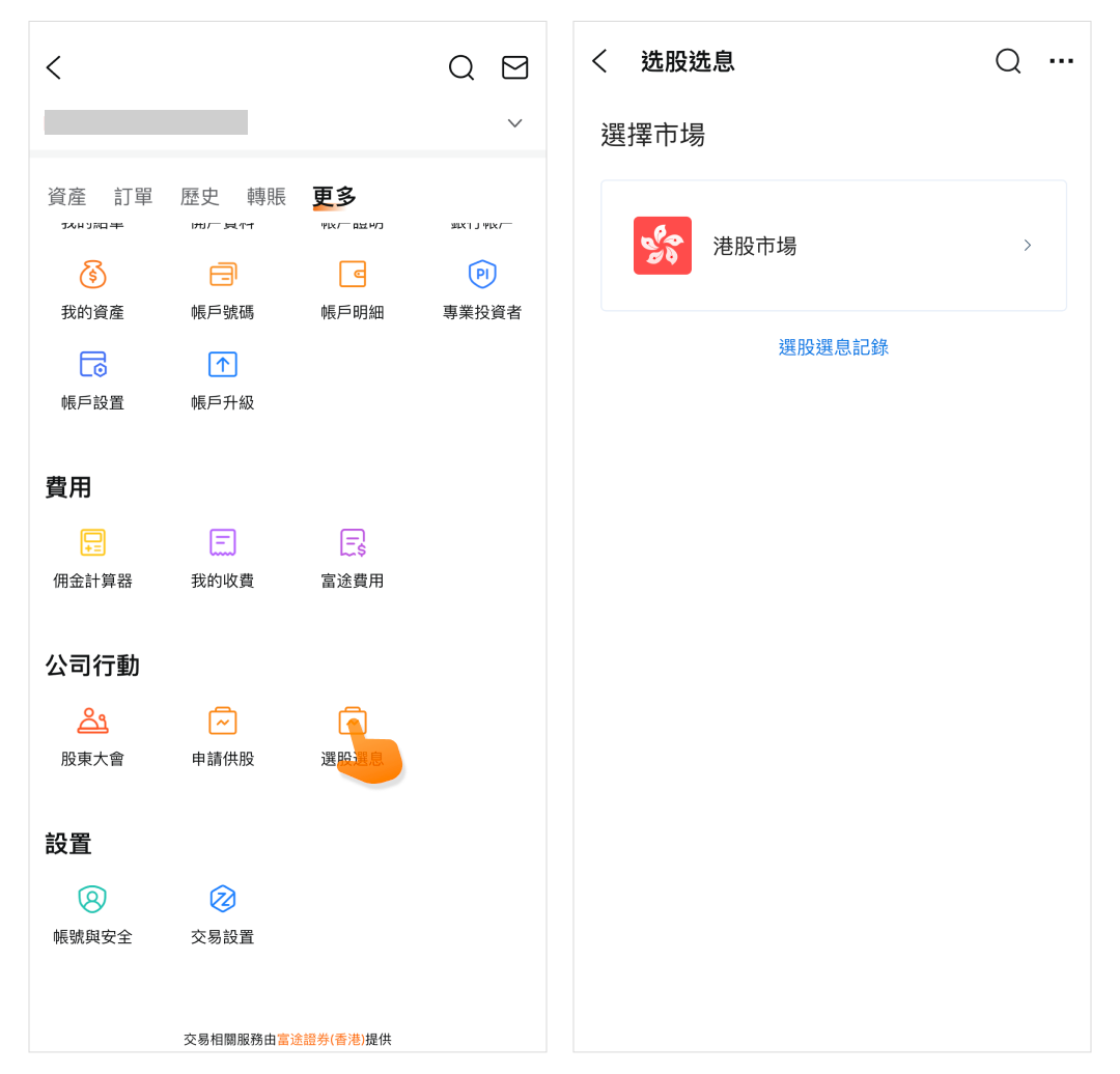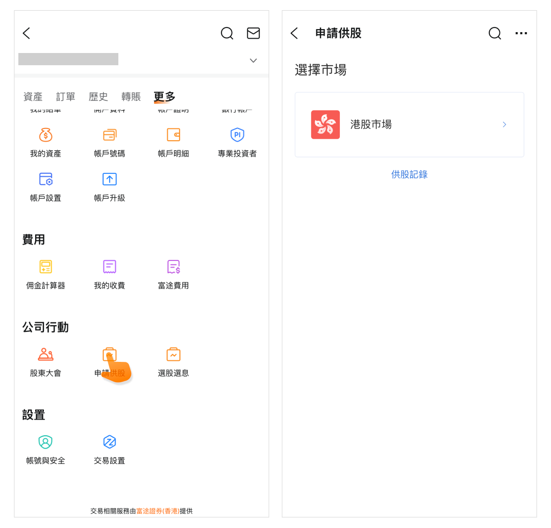 点击「申请供股」并选择「港股市场」,即可了解您持有的待供股股票。