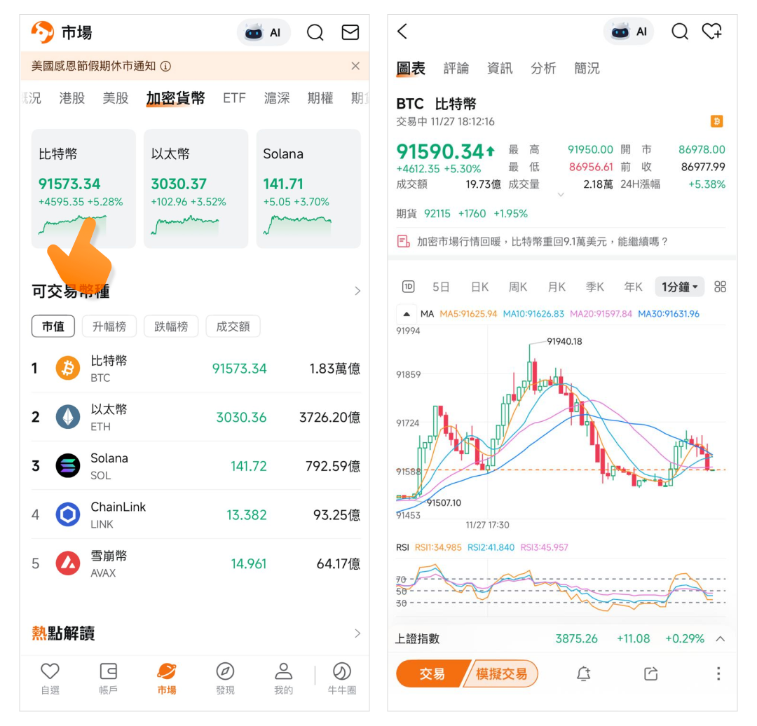 以太币及Solana。若要深入了解价格详情,请点击所需了解的相关加密货币,如“比特币”,即可显示详细报价走势。