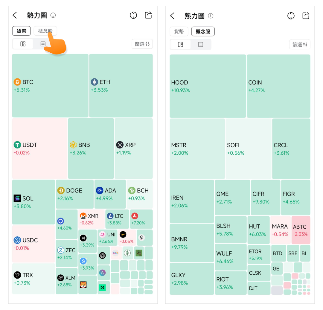 “加密货币”页面的第三个子功能模块是热点解读,主要介绍市场上的热门资讯以及本界面上的热门功能。再往下拉,第四个子功能模块是热力图,您可以在此了解到当前市场不同资产类别当日的涨跌情况。