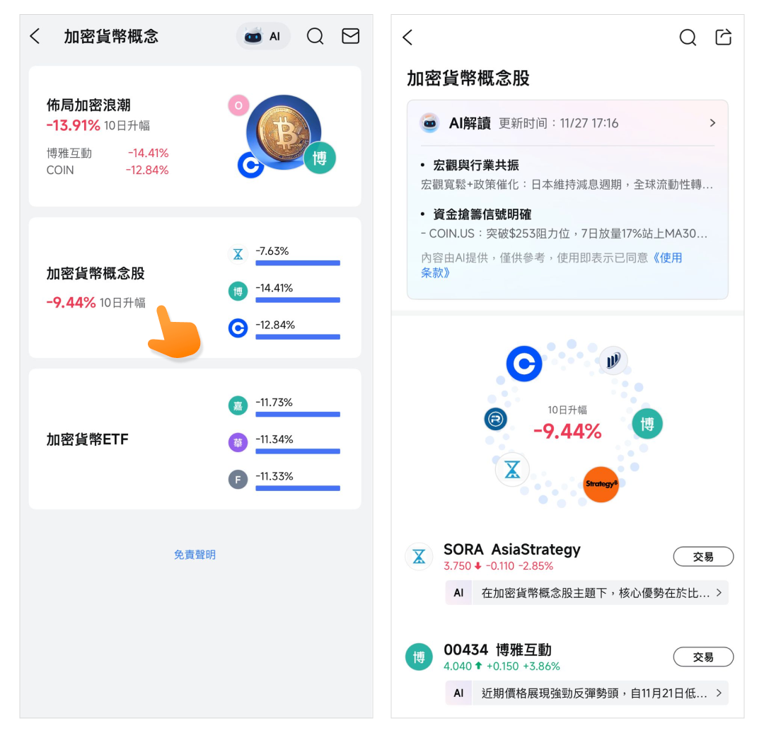 路径:市场页>顶部菜单栏>加密货币>加密货币概念股/加密货币期货/加密货币课堂。