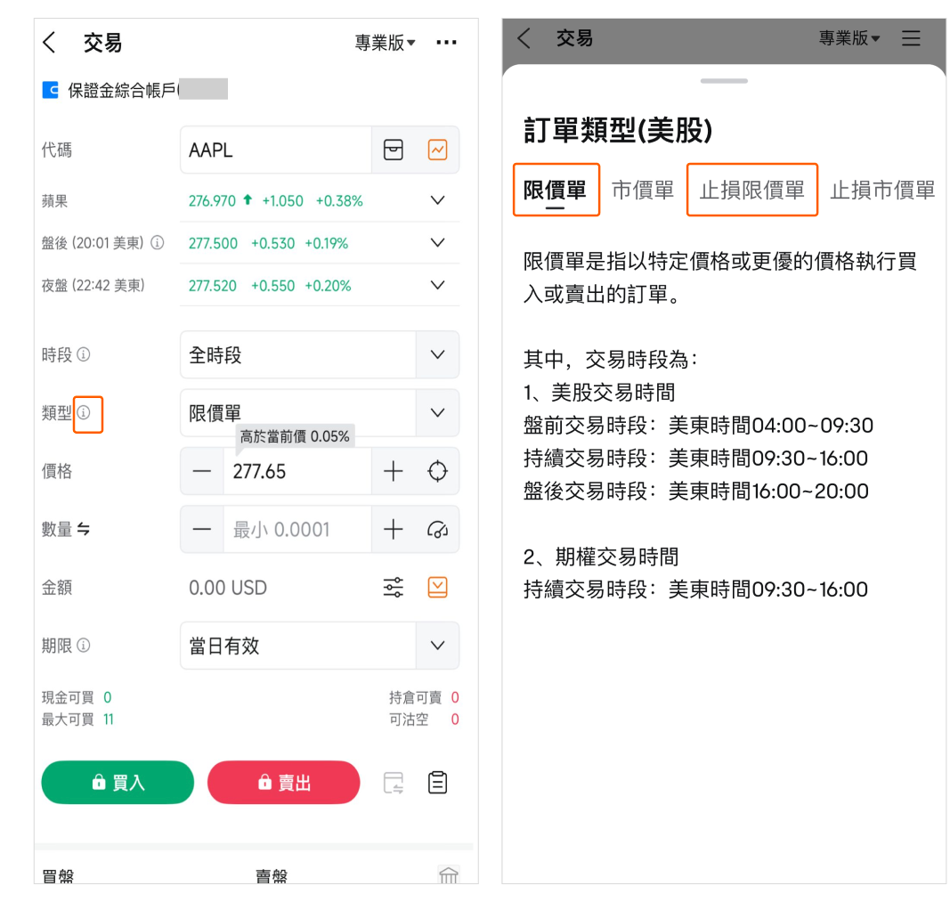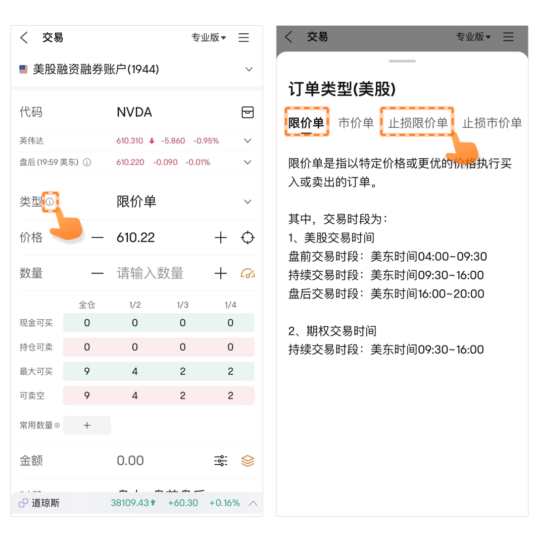 在交易页面,点击类型旁边的 i ,可了解每种订单的定义、图示说明、交易时段、交易说明。