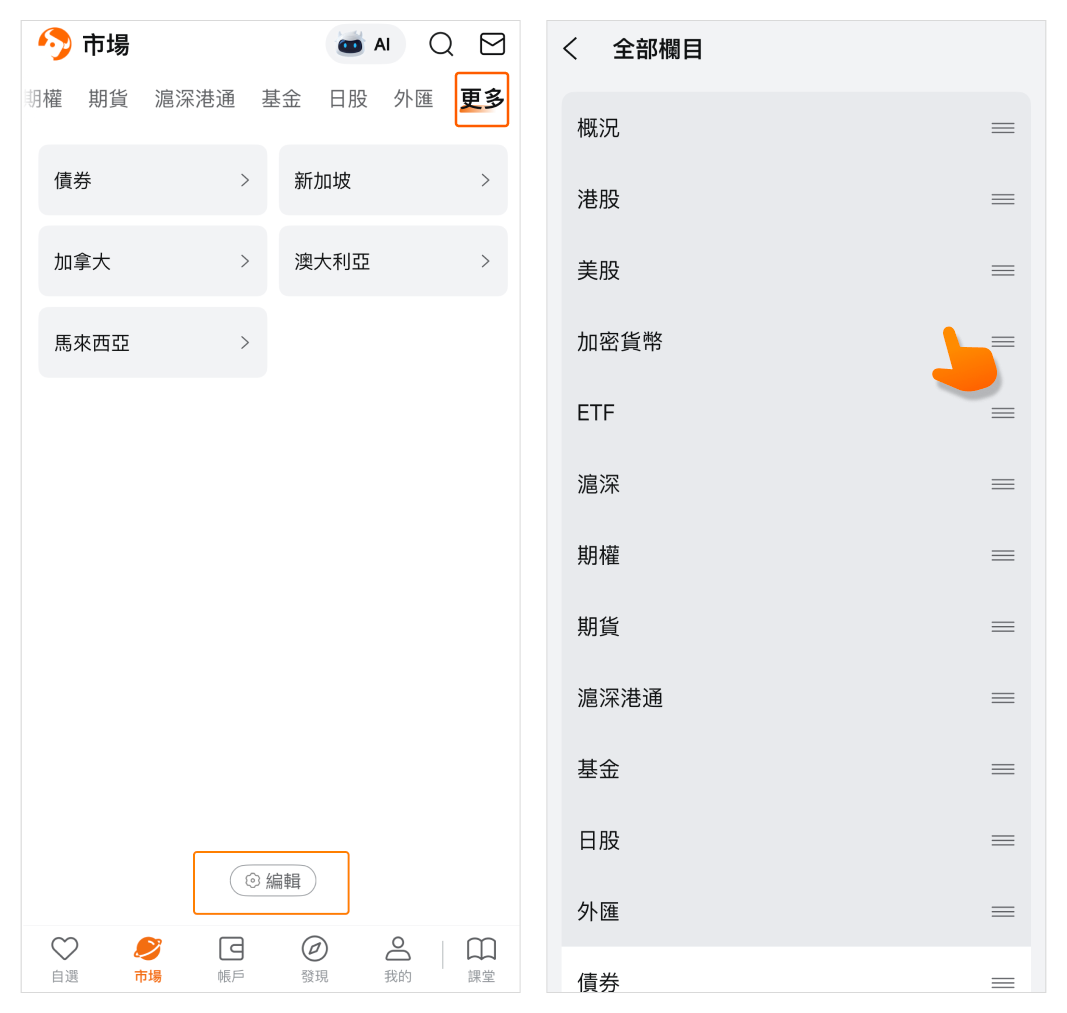 “市场”页面,这里有您需要了解的环球投资世界的关键数据,如环球指数、各地股票、债券等,帮助您了解全球资产的动态。