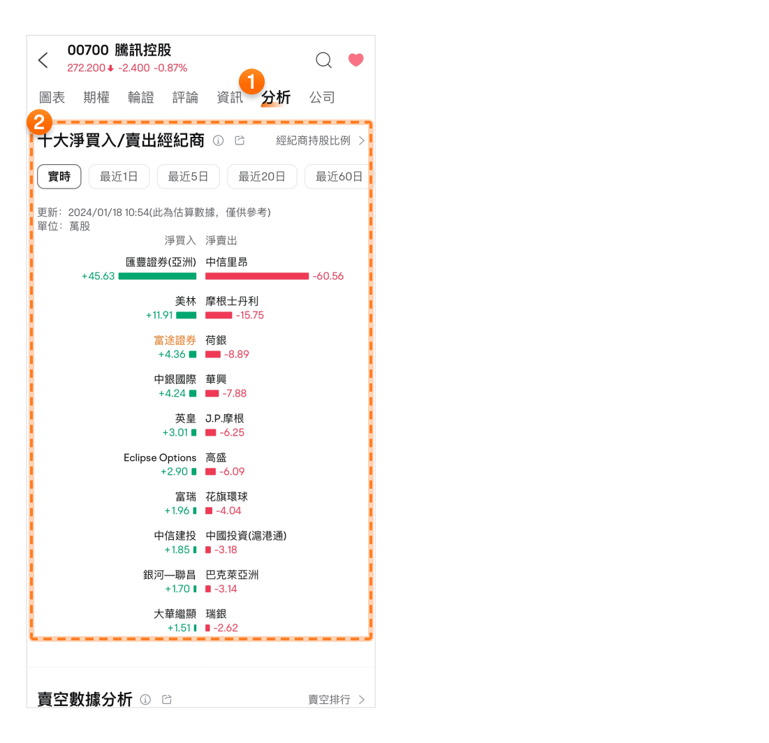 路径:个股页>分析>十大净买入/卖出经纪商查看详情。