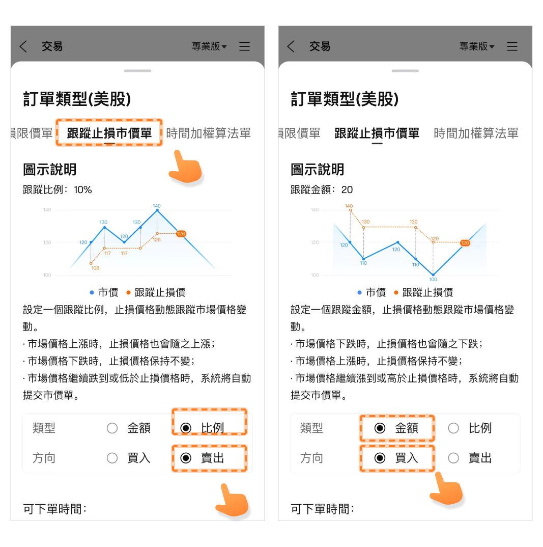 跟踪止损市价单:当你买入股票时,你可以通过跟踪止损市价单一边控制亏损,一边控制盈利,在卖出方向,订单触发价格将根据你设定的跟踪比例或金额进行动态调整(可参考图),卖出方向一旦下跌击穿你设定的止损比例,将自动提交市价单止损;或者当你卖空股票时,你也可以通过跟踪止损市价单控制亏损,在买入方向,一旦上涨击穿你设定的跟踪比例,将自动提交市价单止损。