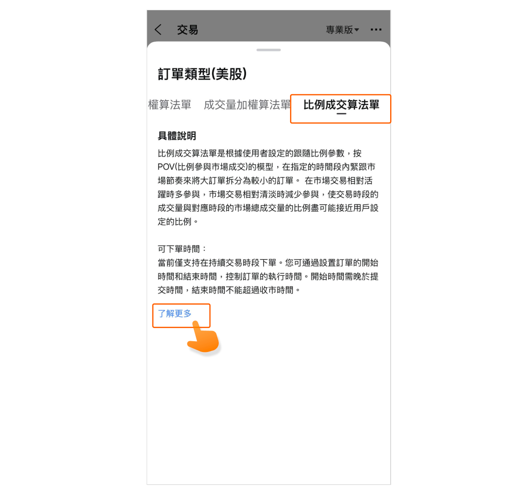 点击订单右侧的「∨」符号,可选择基础订单、条件订单、算法订单等多种订单。