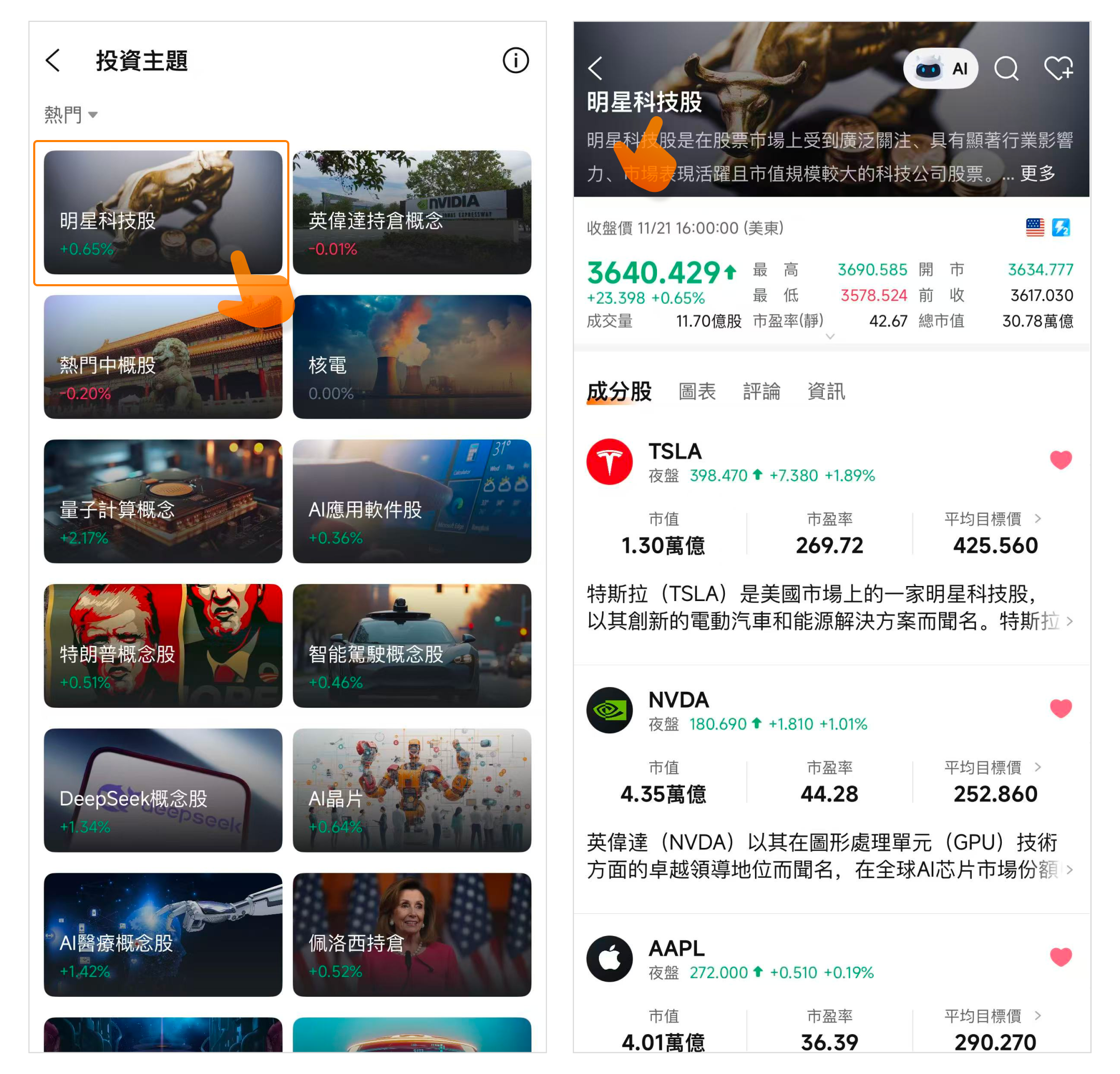 路径:点击市场>「港股」或「美股」>「投资主题」。