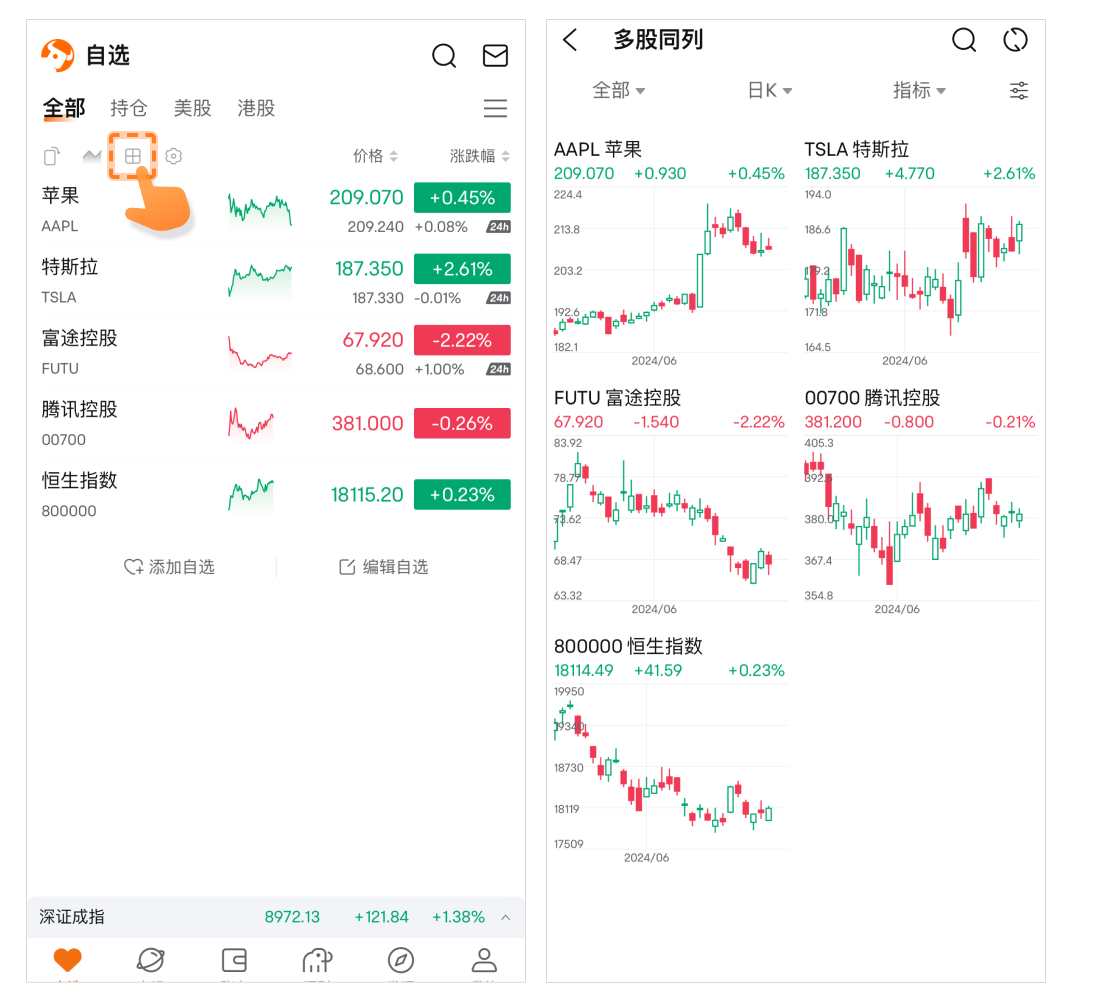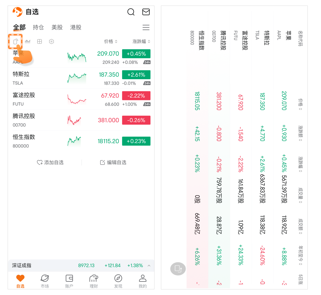 自选列表页有3个图标可以快速更改列表视图:
