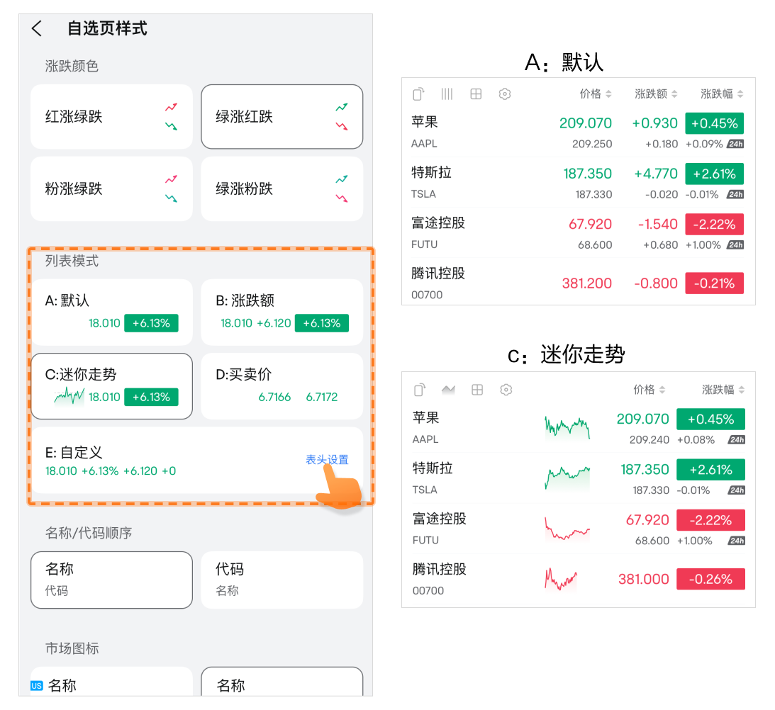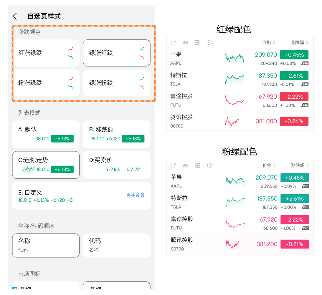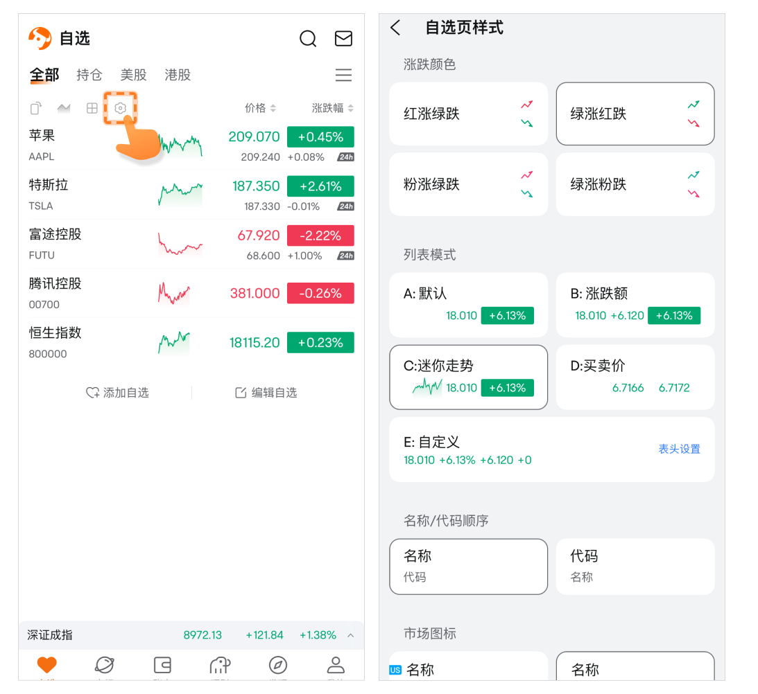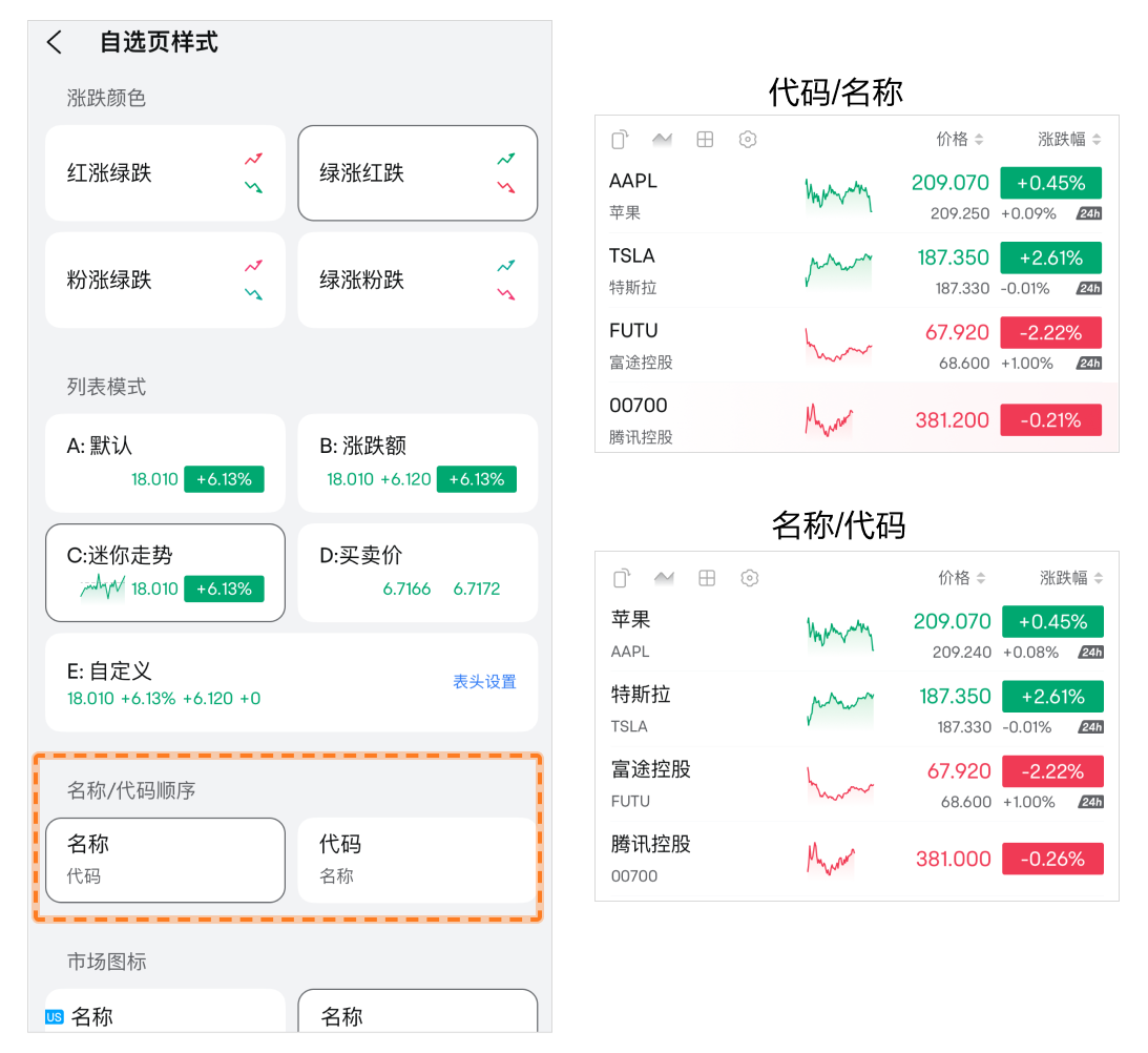 • 名称/代码顺序:自选列表中优先展示名称或是代码。