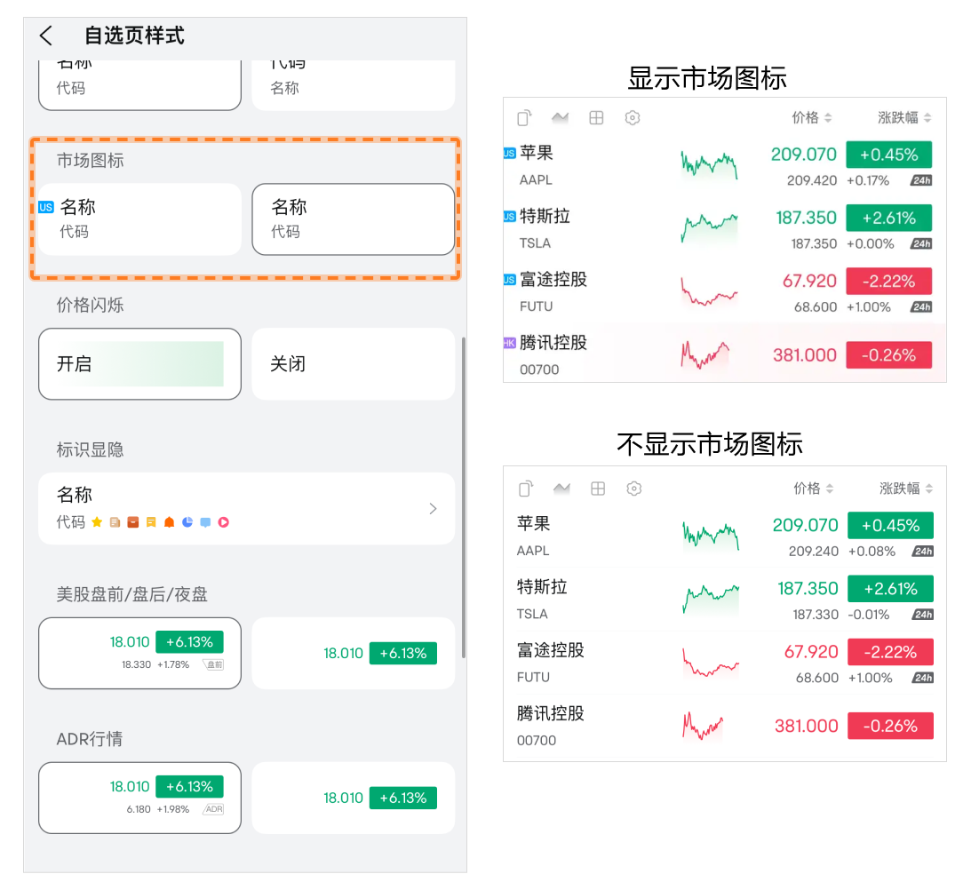 • 美股盘前/盘后/夜盘:开启后会在列表中展示盘前/盘后/夜盘图标。