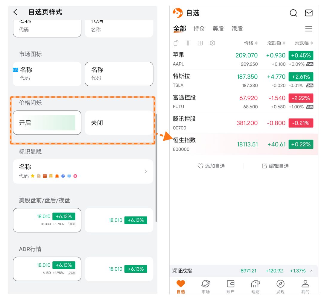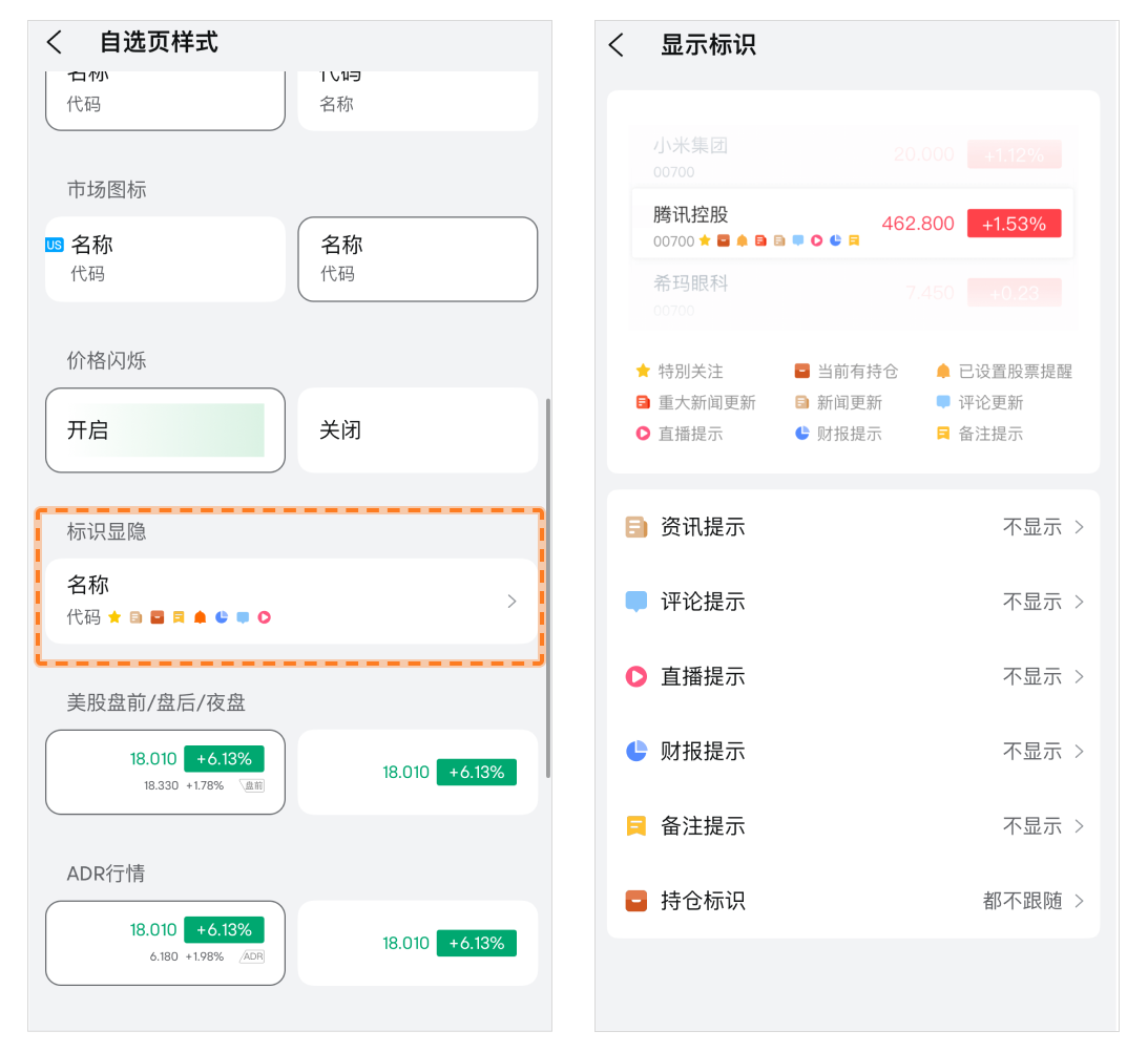 • ADR行情:开启后会在列表中显示港股对应的美股ADR报价。