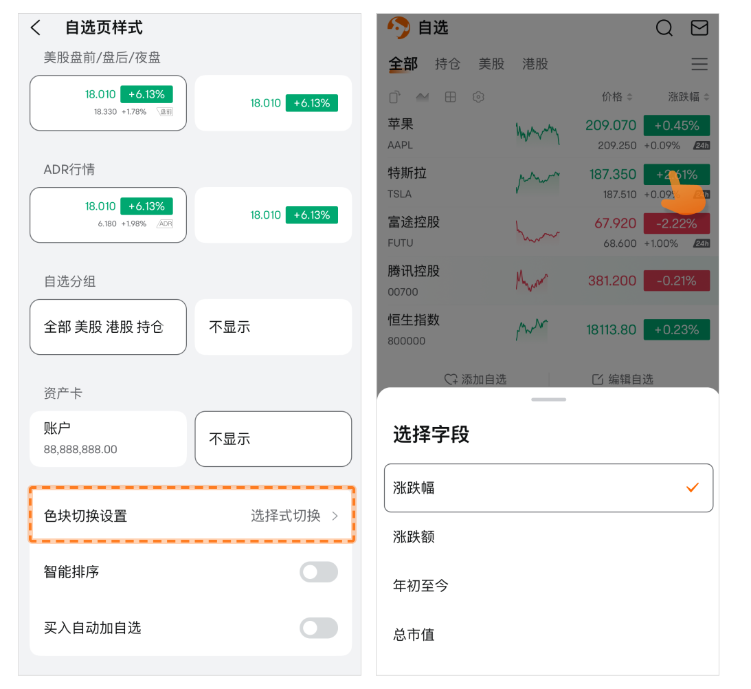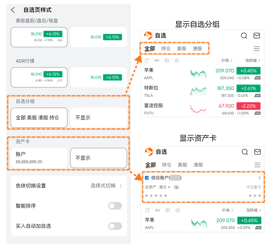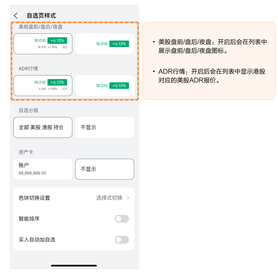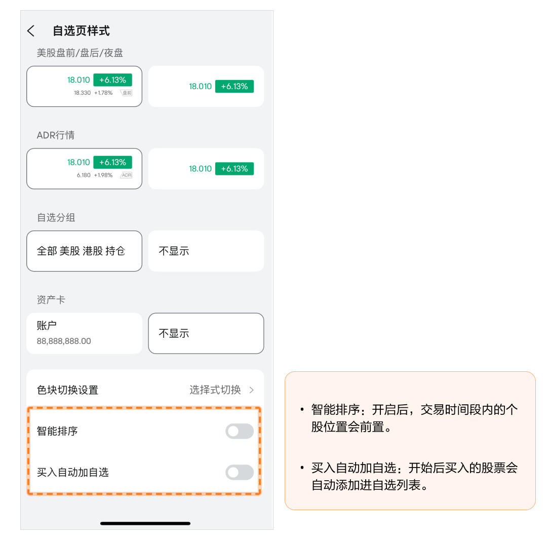 • 资产卡:开启后会在自选列表顶部显示账户资产信息。